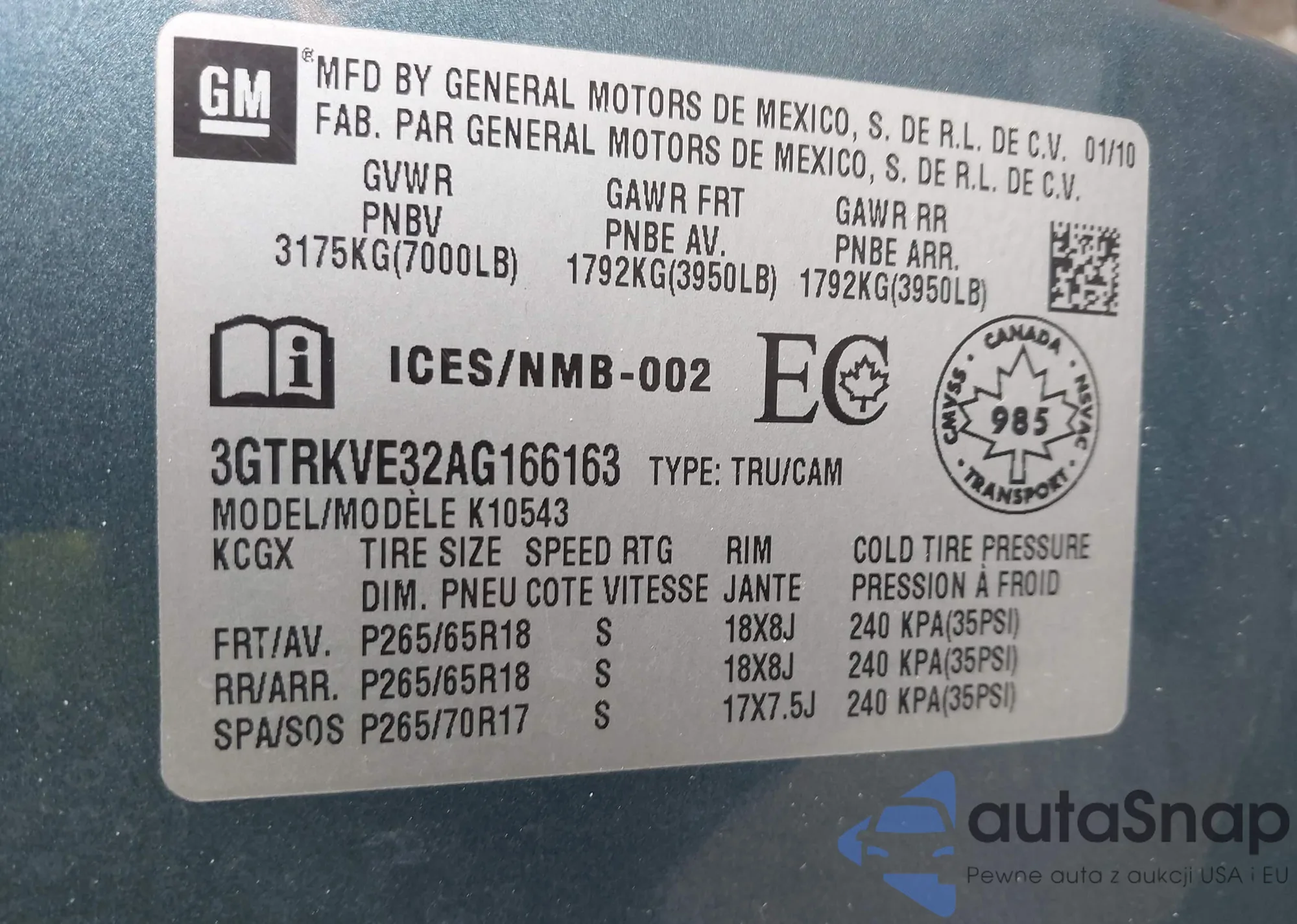 • VIN 3GTRKVE32AG166163