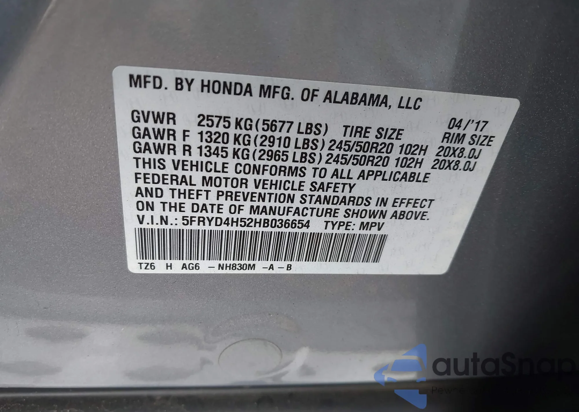 • VIN 2HKRM4H53GH674904