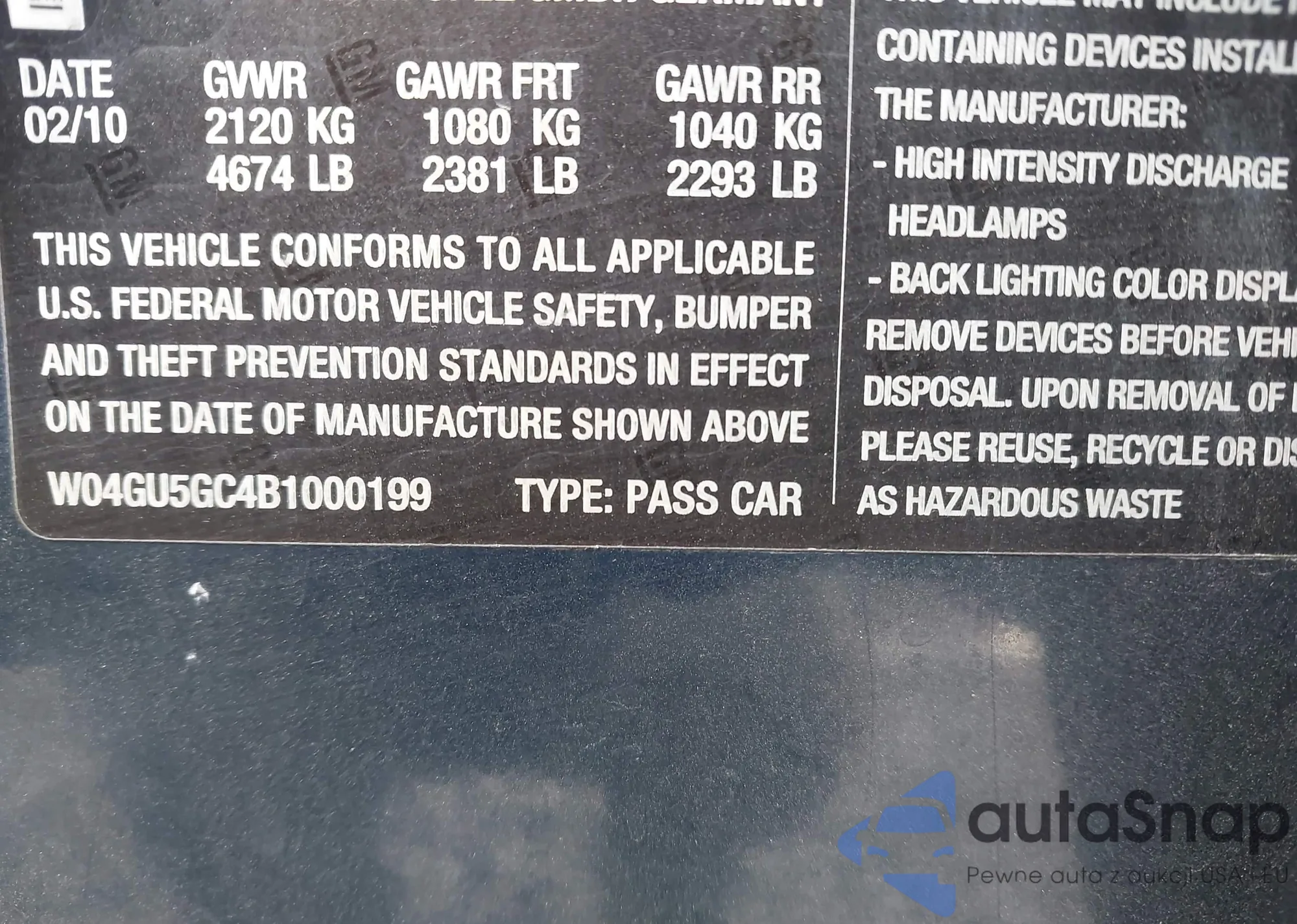 LOT: 43660794 VIN: W04GU5GC4B1000199