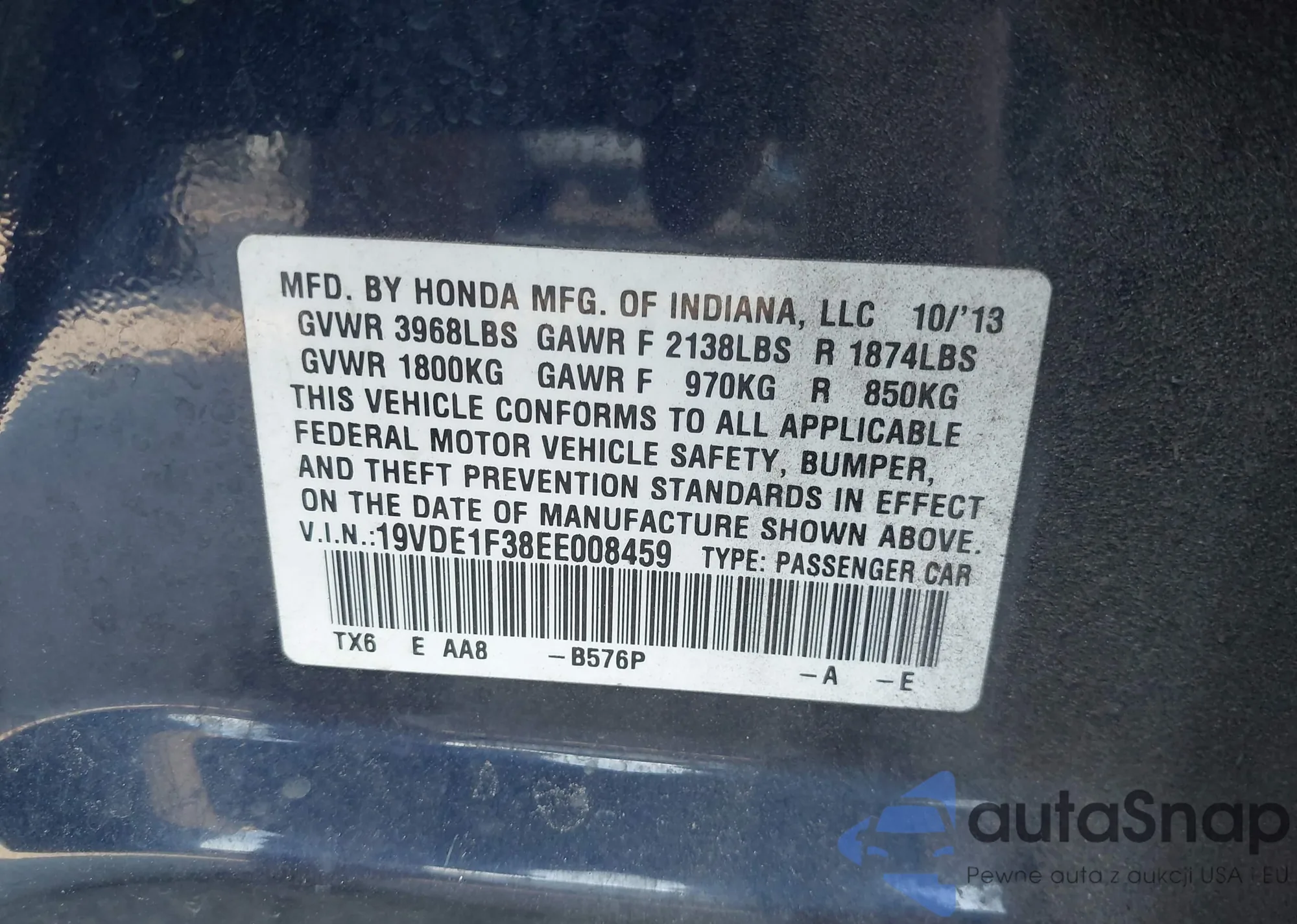 LOT: 43520568 VIN: 19VDE1F38EE008459