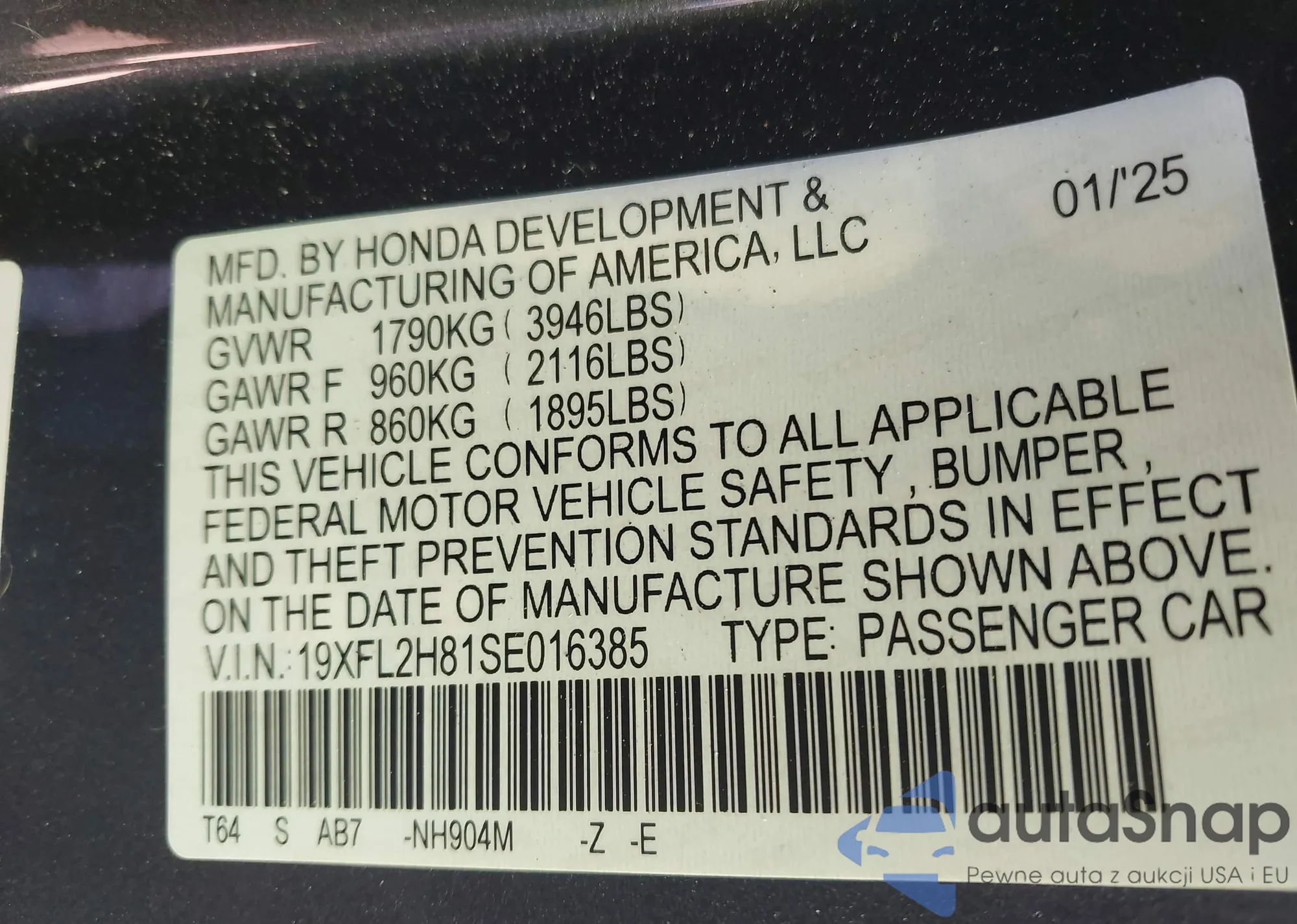 • VIN 19XFL2H81SE016385