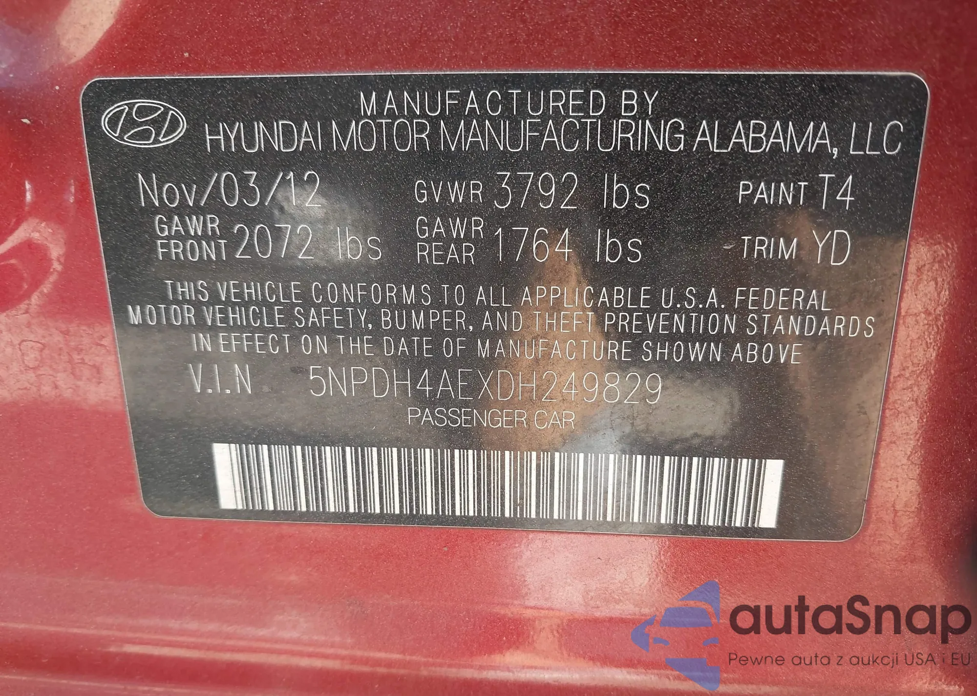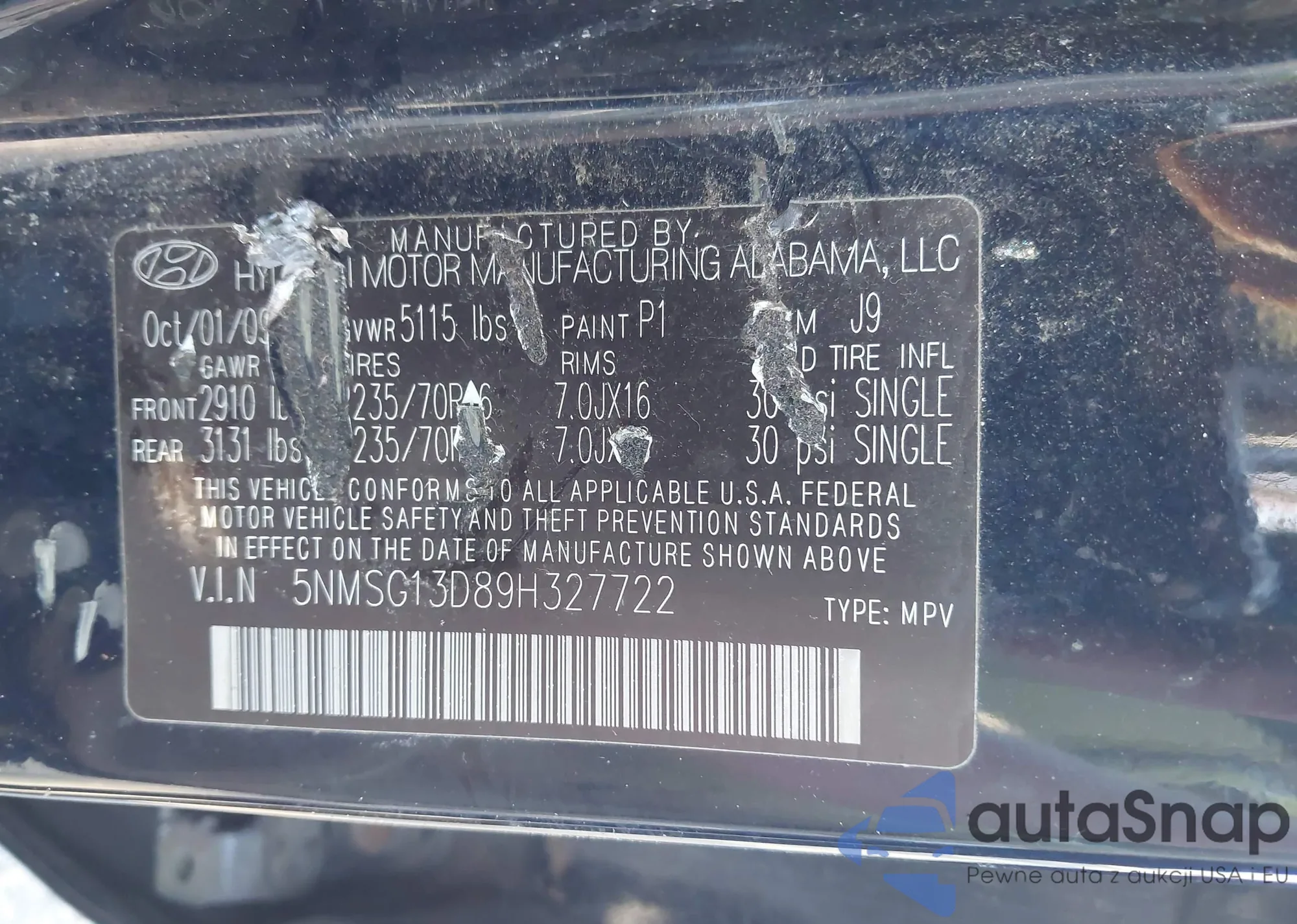 LOT: 43640034 VIN: 5NMSG13D89H327722