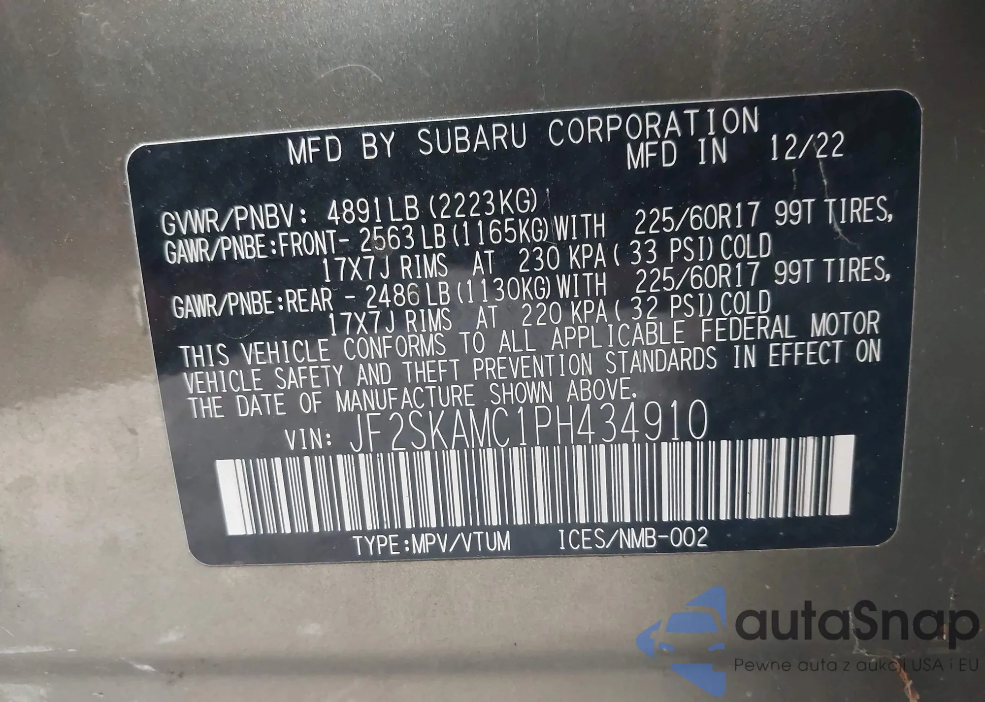 LOT: 43616735 VIN: JF2SKAMC1PH434910