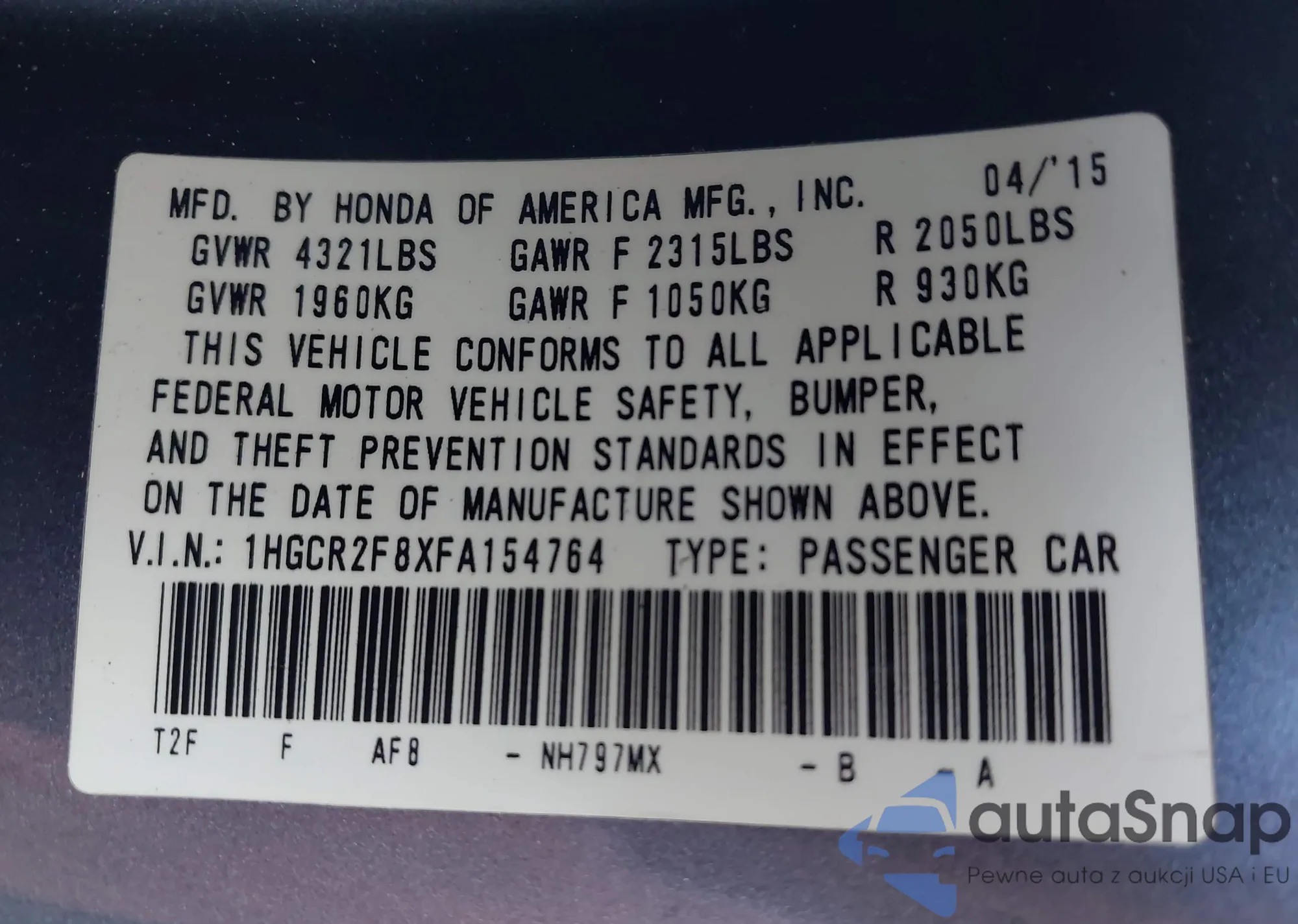LOT: 43651583 VIN: 1HGCR2F8XFA154764