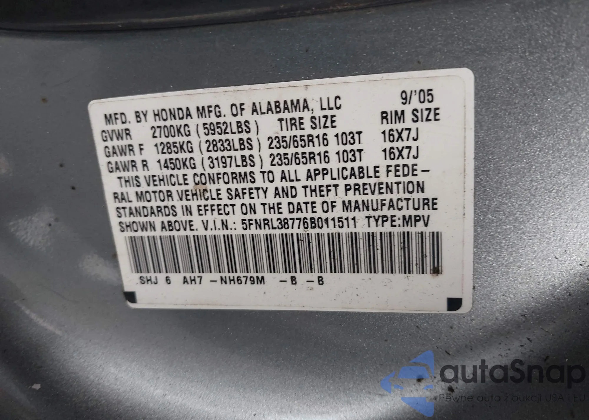 • VIN 5FNRL38776B011511