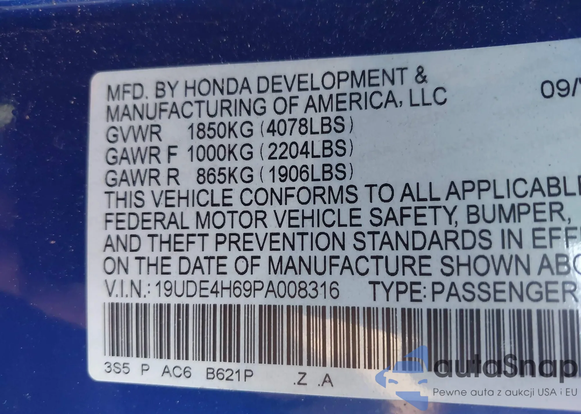 • VIN 19UDE4H69PA008316