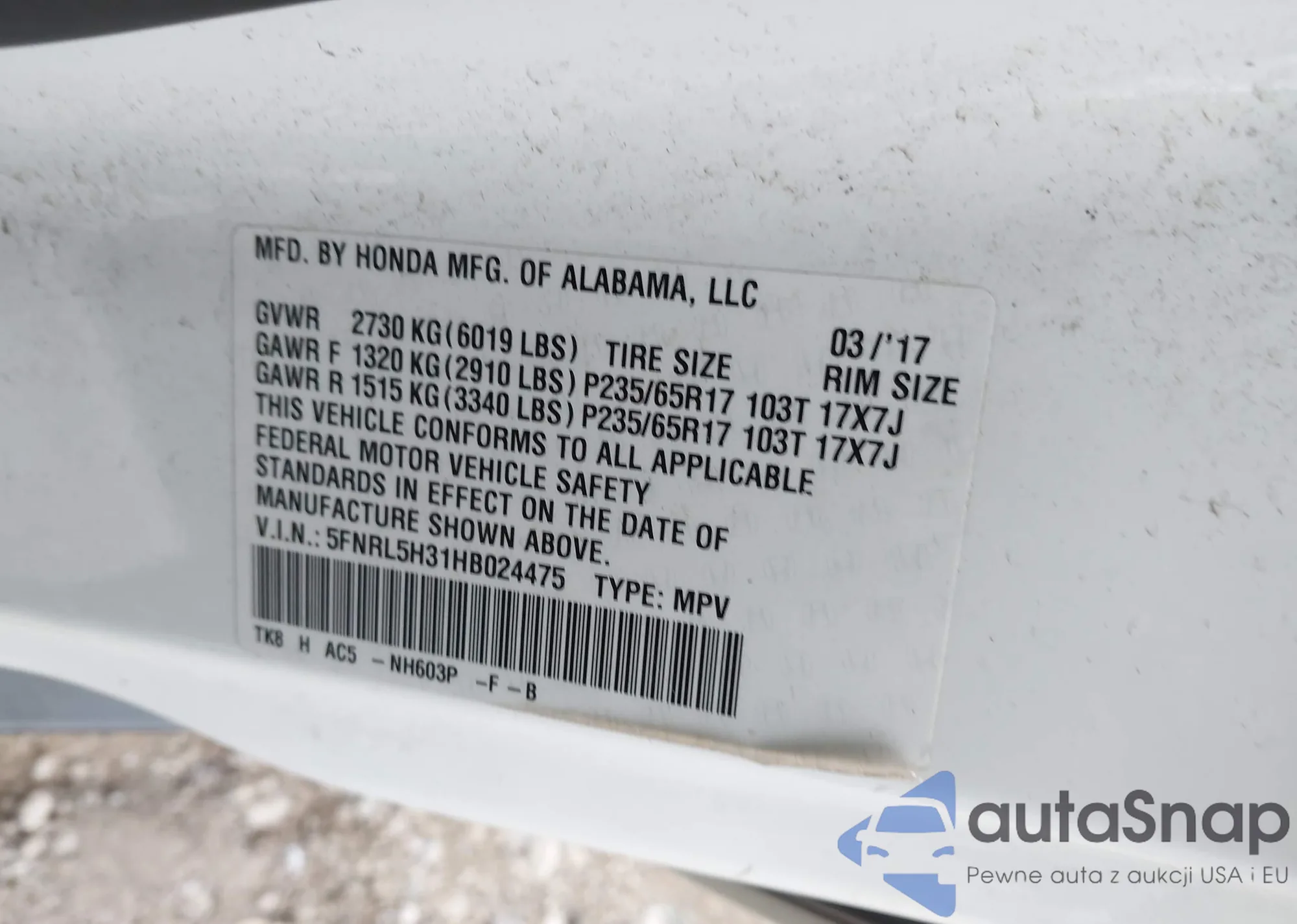• VIN 5FNRL5H31HB024475
