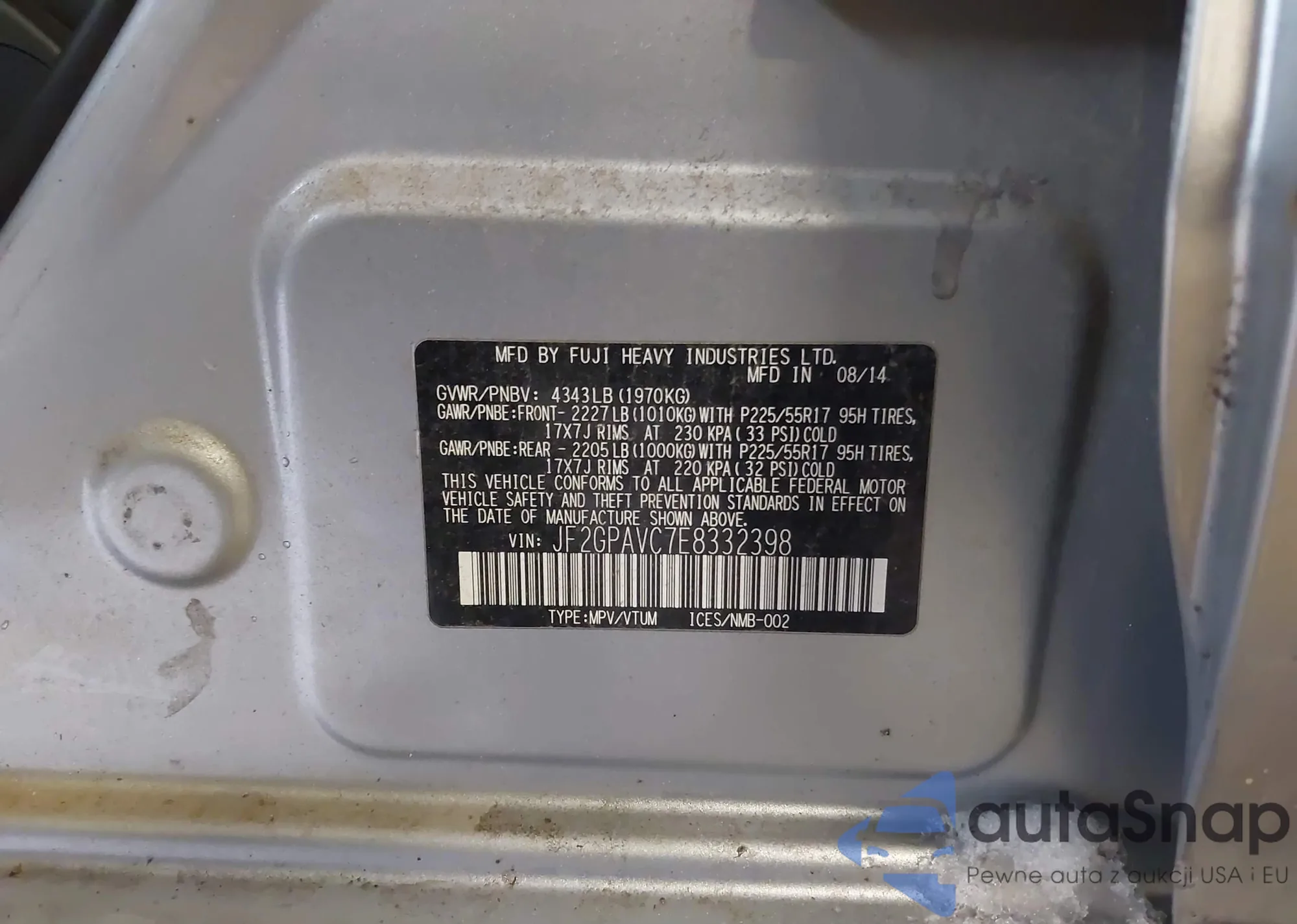 LOT: 43807987 VIN: JF2GPAVC7E8332398