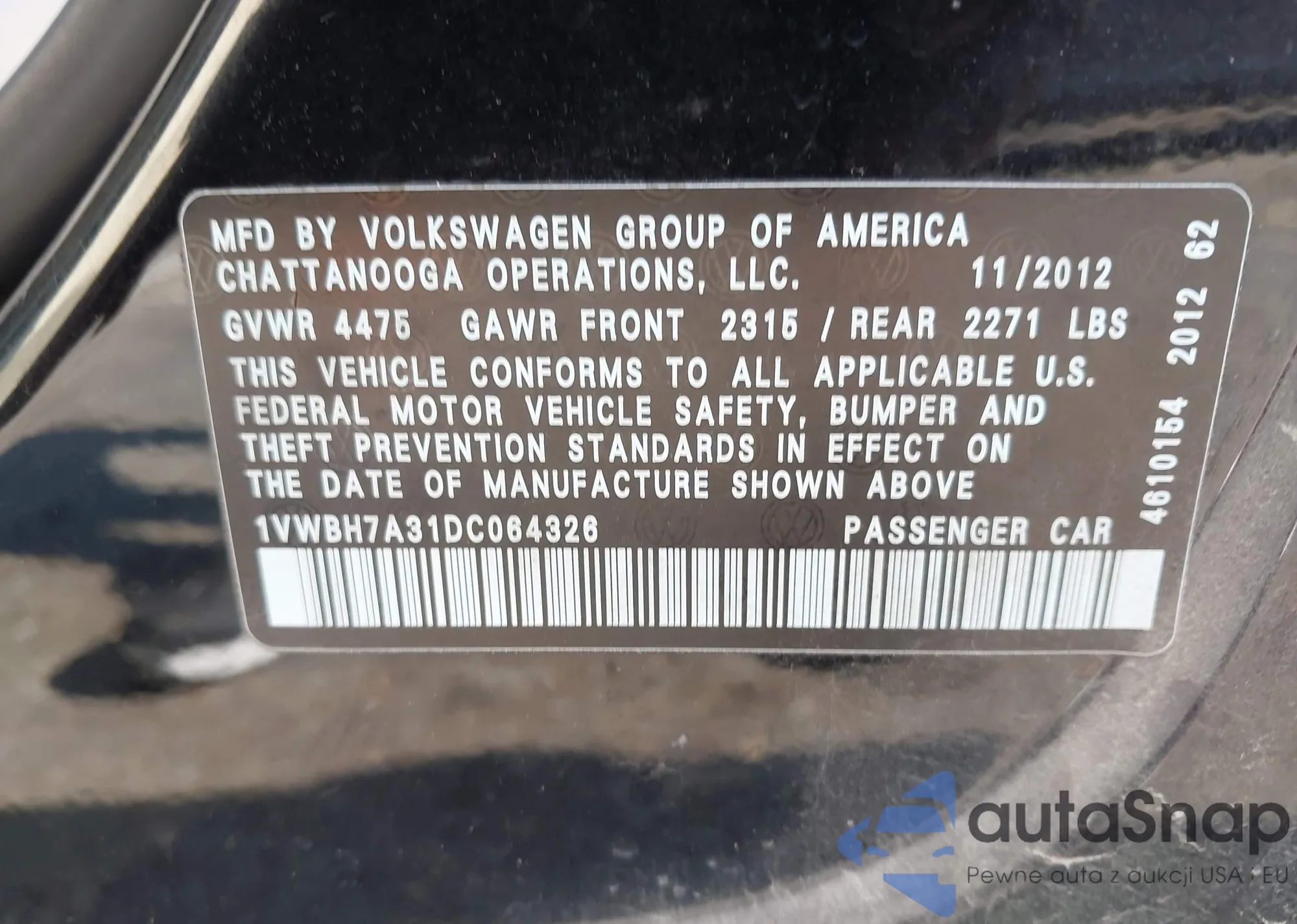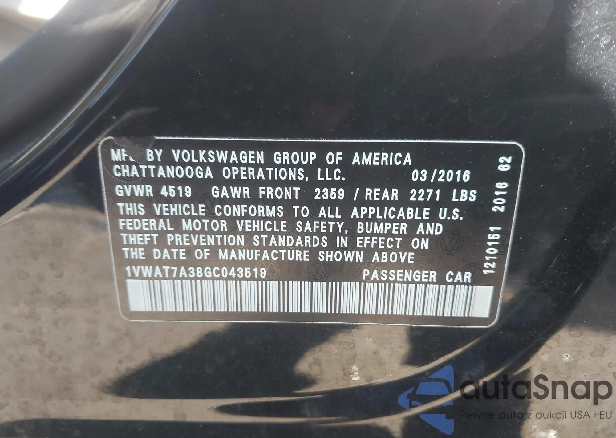 LOT: 43706482 VIN: 1VWAT7A38GC043519