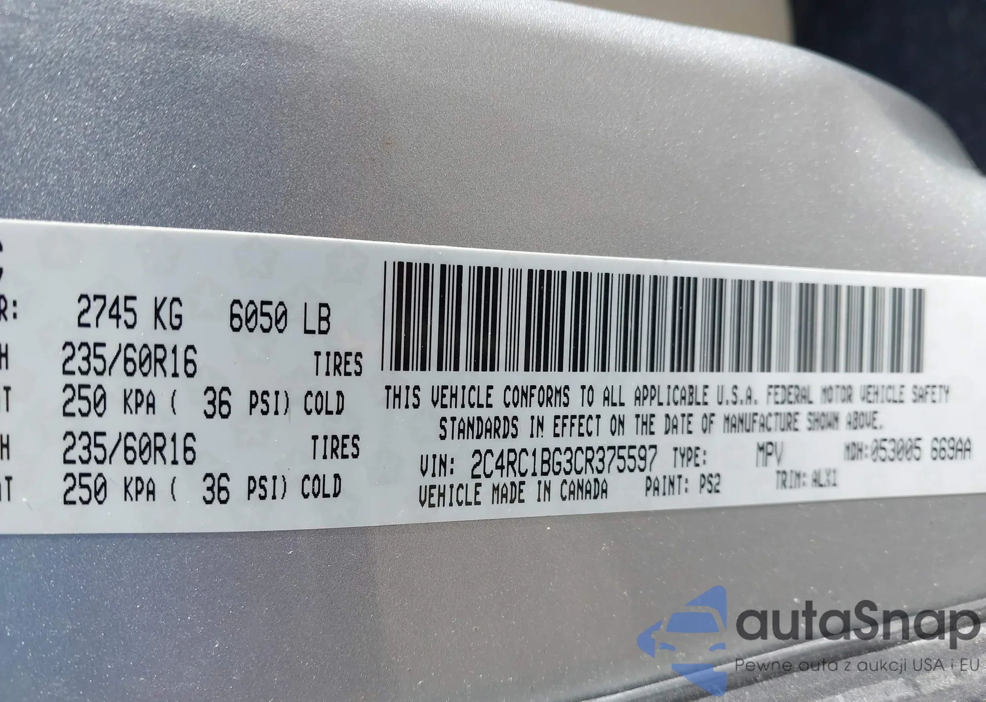LOT: 43797258 VIN: 2C4RC1BG3CR375597