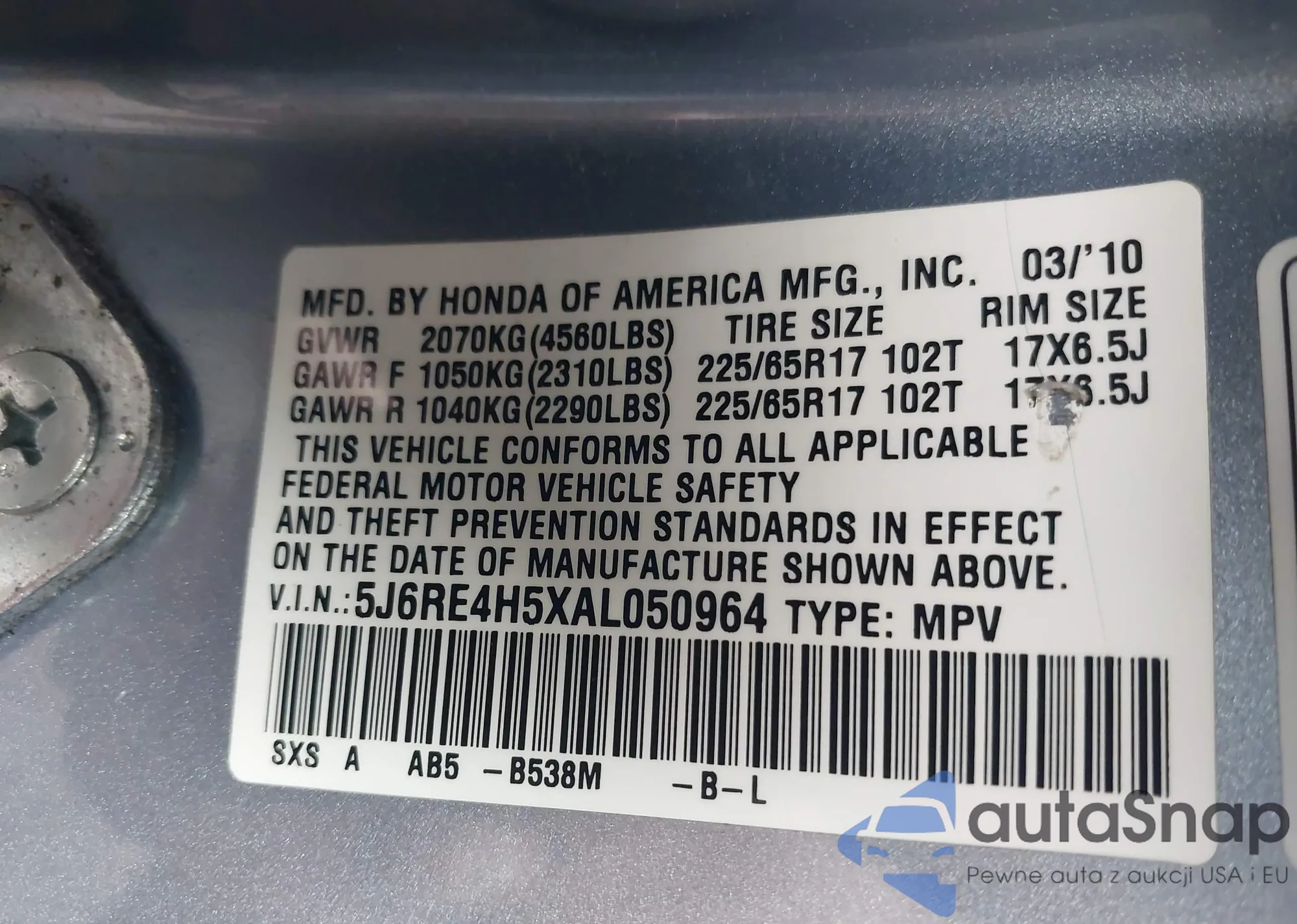 • VIN 5J6RE4H5XAL050964