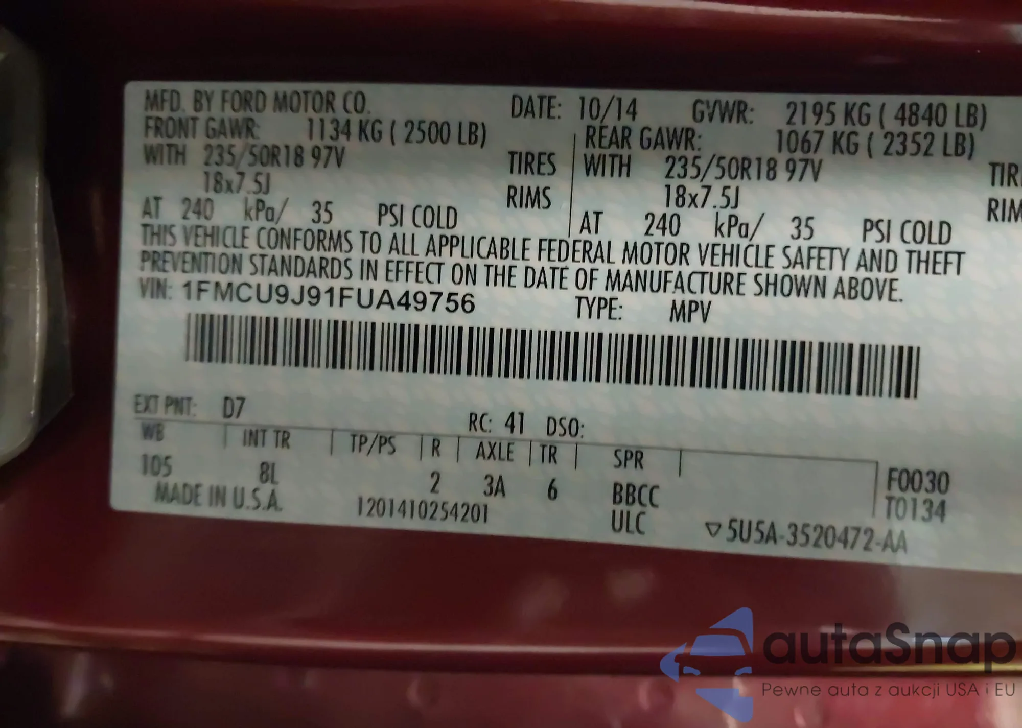 LOT: 43808086 VIN: 1FMCU9J91FUA49756