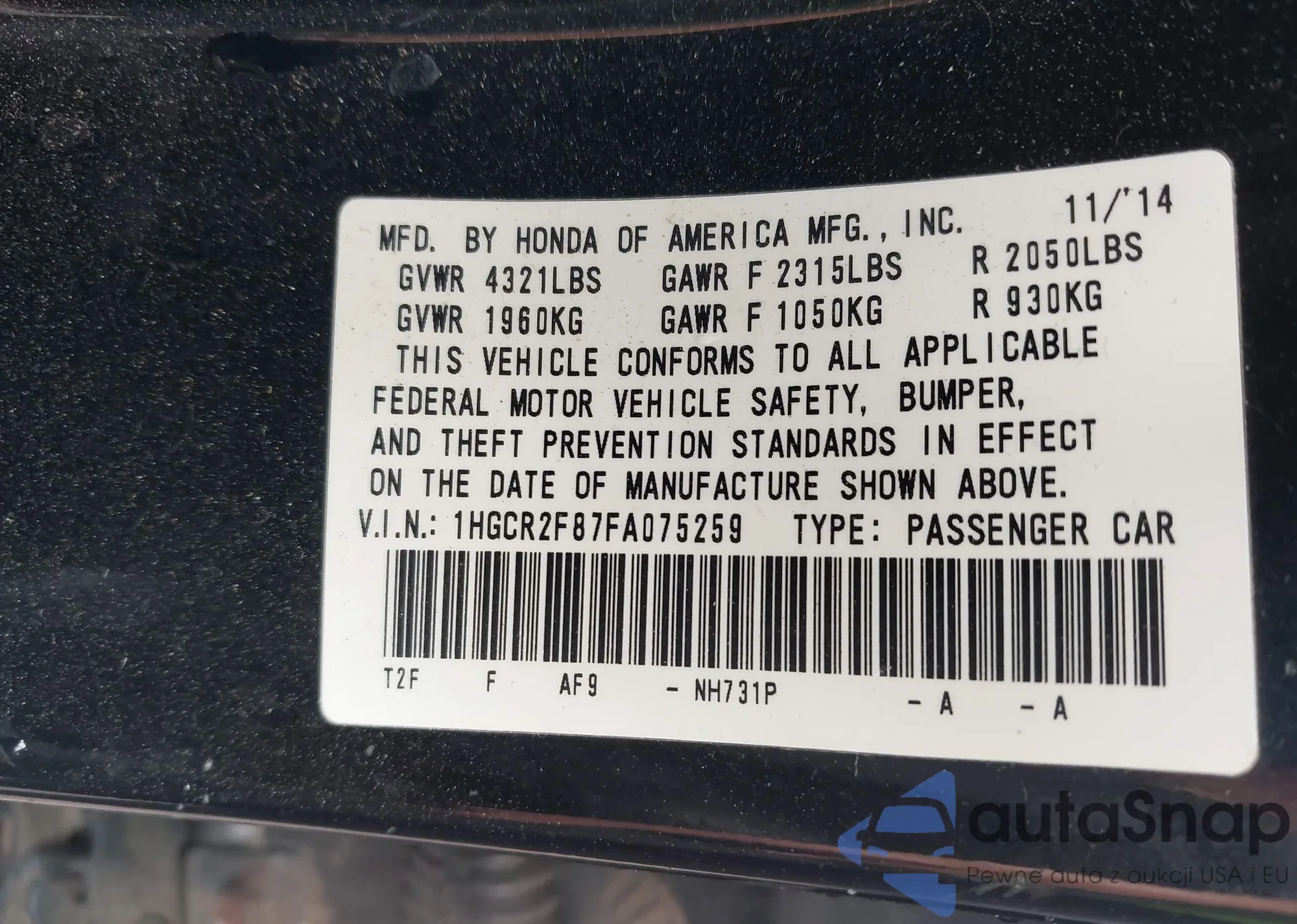 • VIN 1HGCR2F87FA075259