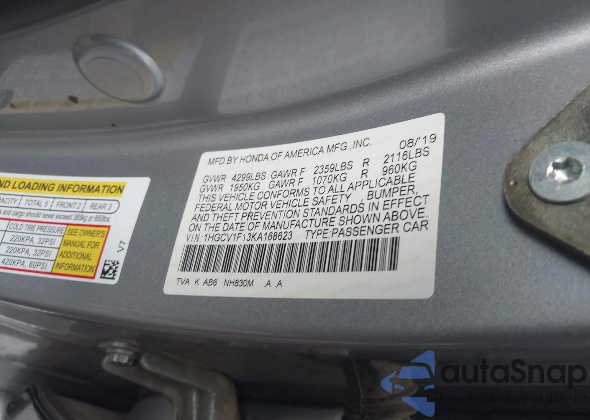 LOT: 43572864 VIN: 1HGCV1F13KA168623