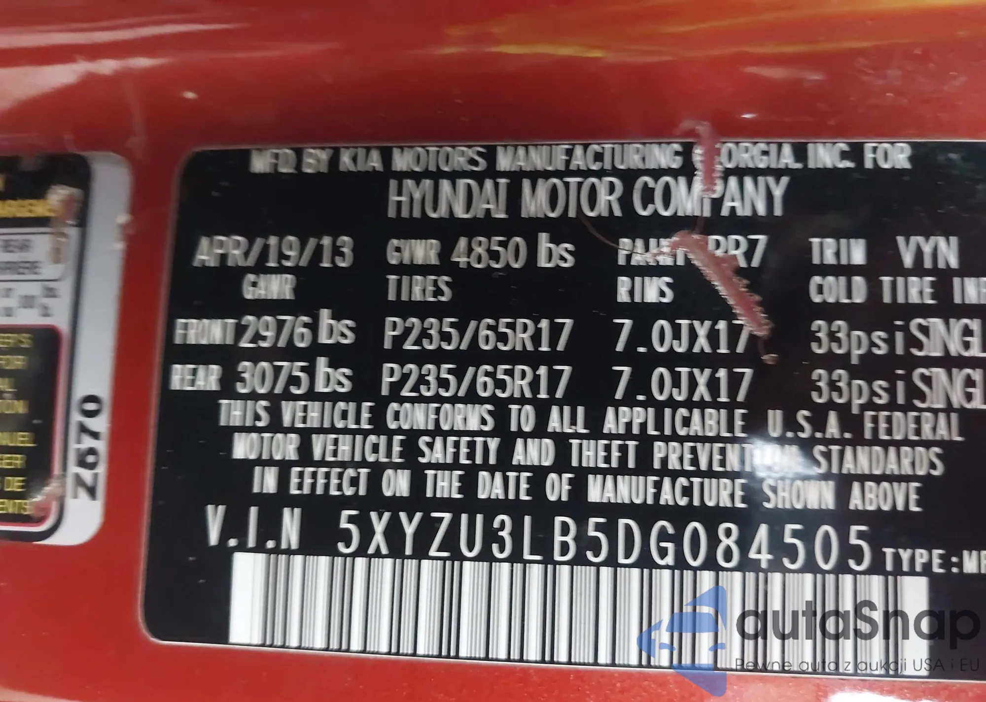 • VIN 5XYZU3LB5DG084505
