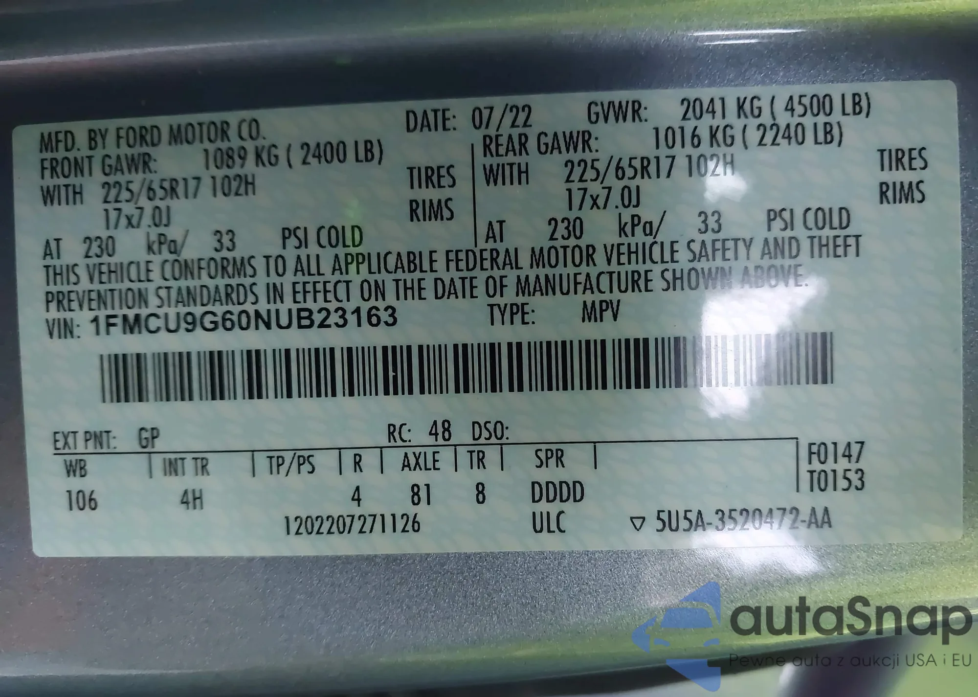 LOT: 43649346 VIN: 1FMCU9G60NUB23163