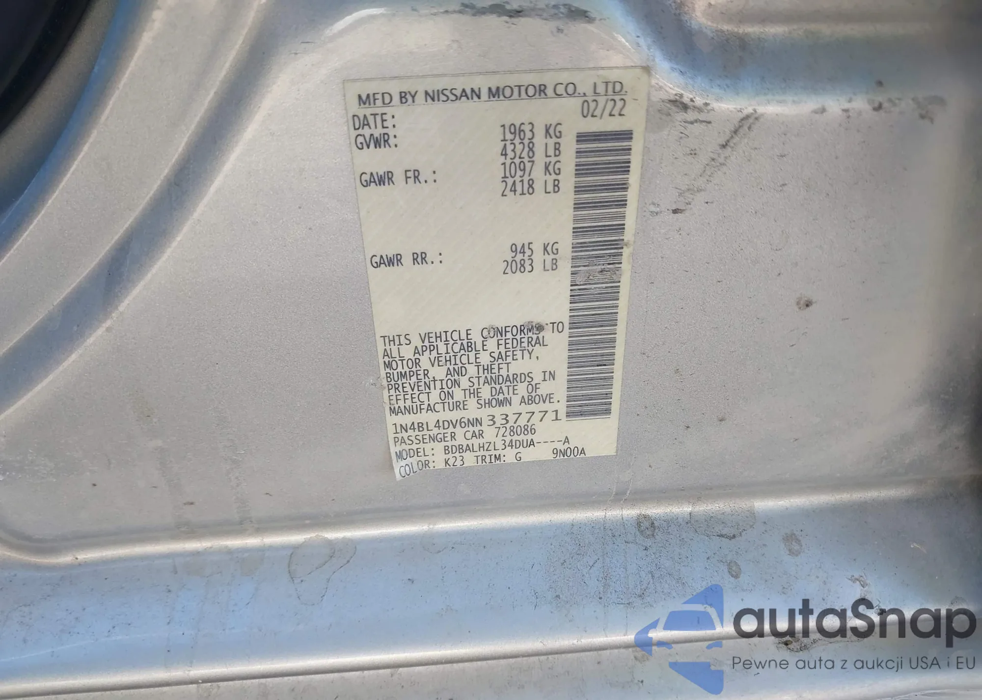 LOT: 43742362 VIN: 1N4BL4DV6NN337771