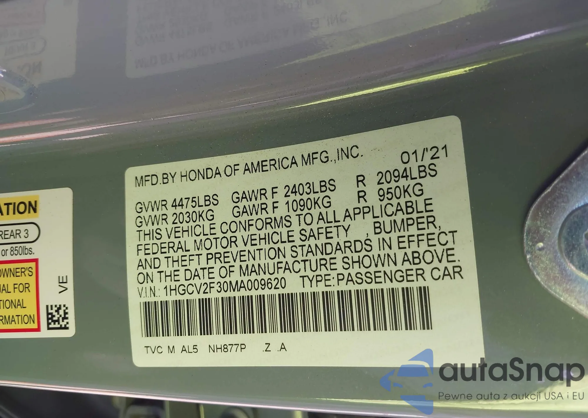 LOT: 43483677 VIN: 1HGCV2F30MA009620