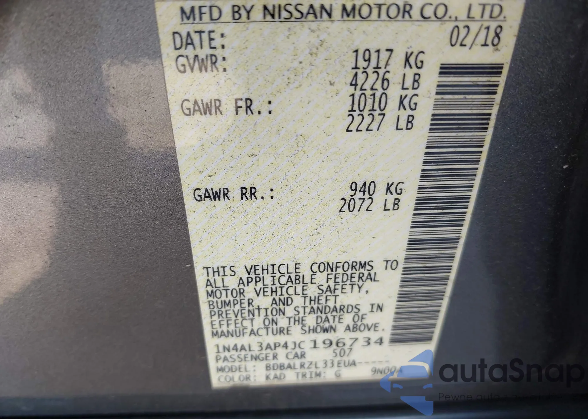 LOT: 43197318 VIN: 1N4AL3AP4JC196734