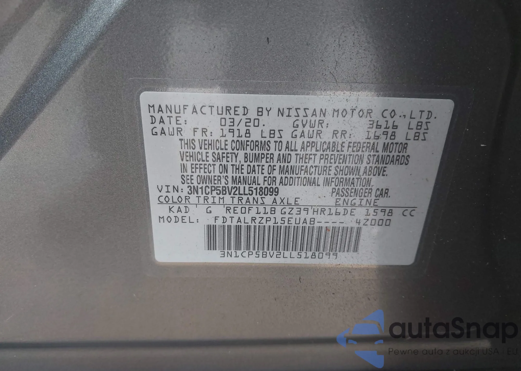LOT: 43676283 VIN: WP0AA2A71LL103195
