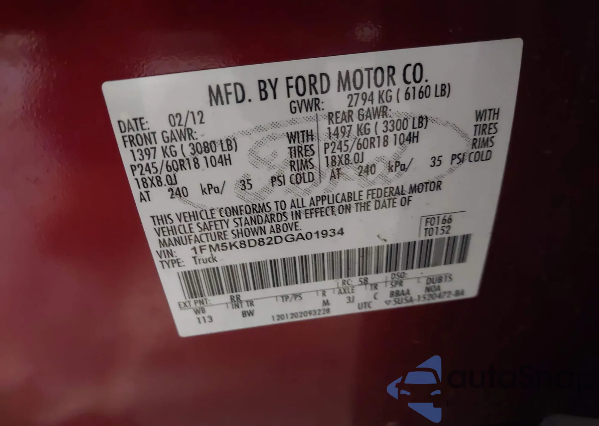 LOT: 43486282 VIN: 1FM5K8D82DGA01934