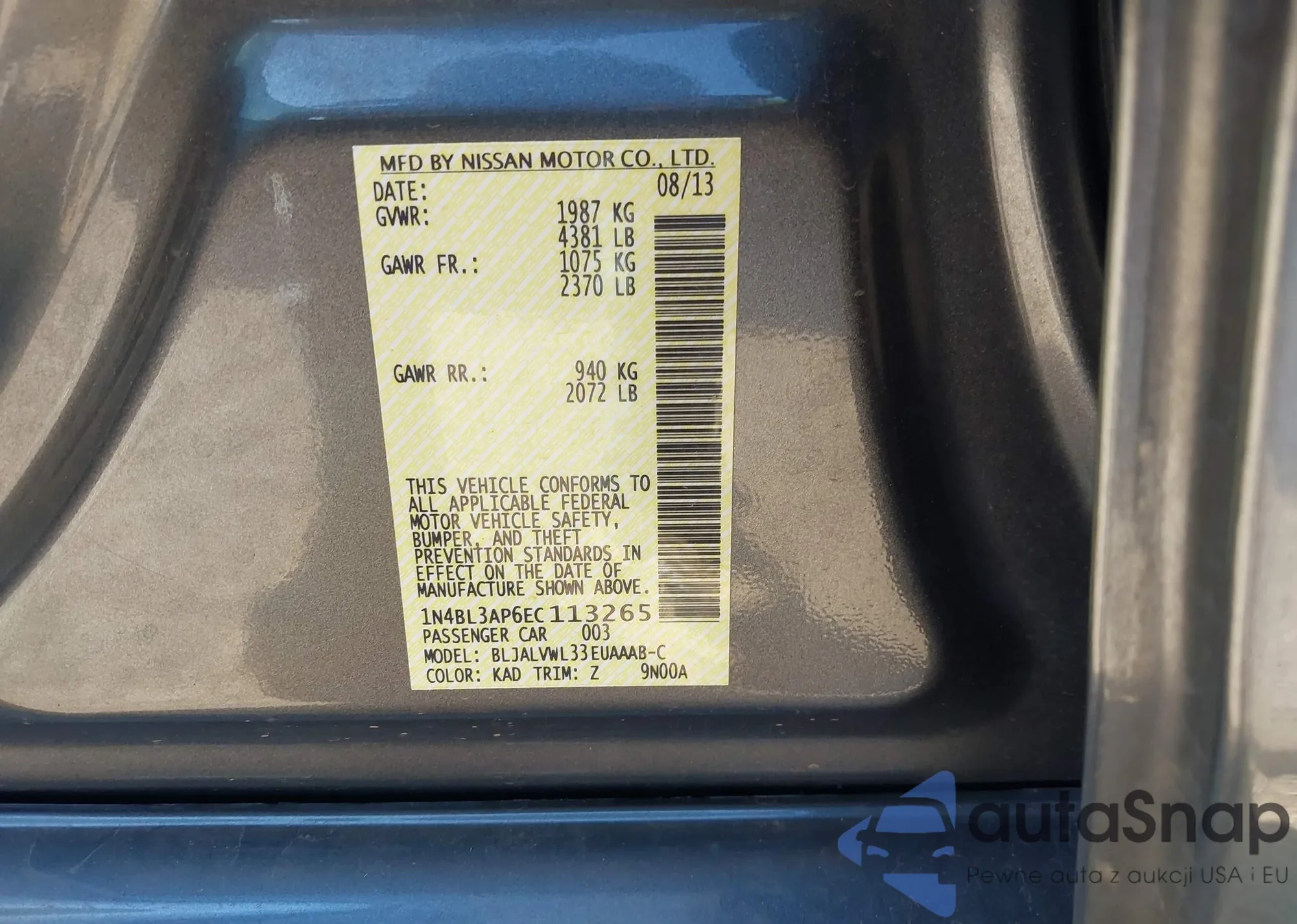 • VIN 1N4BL3AP6EC113265