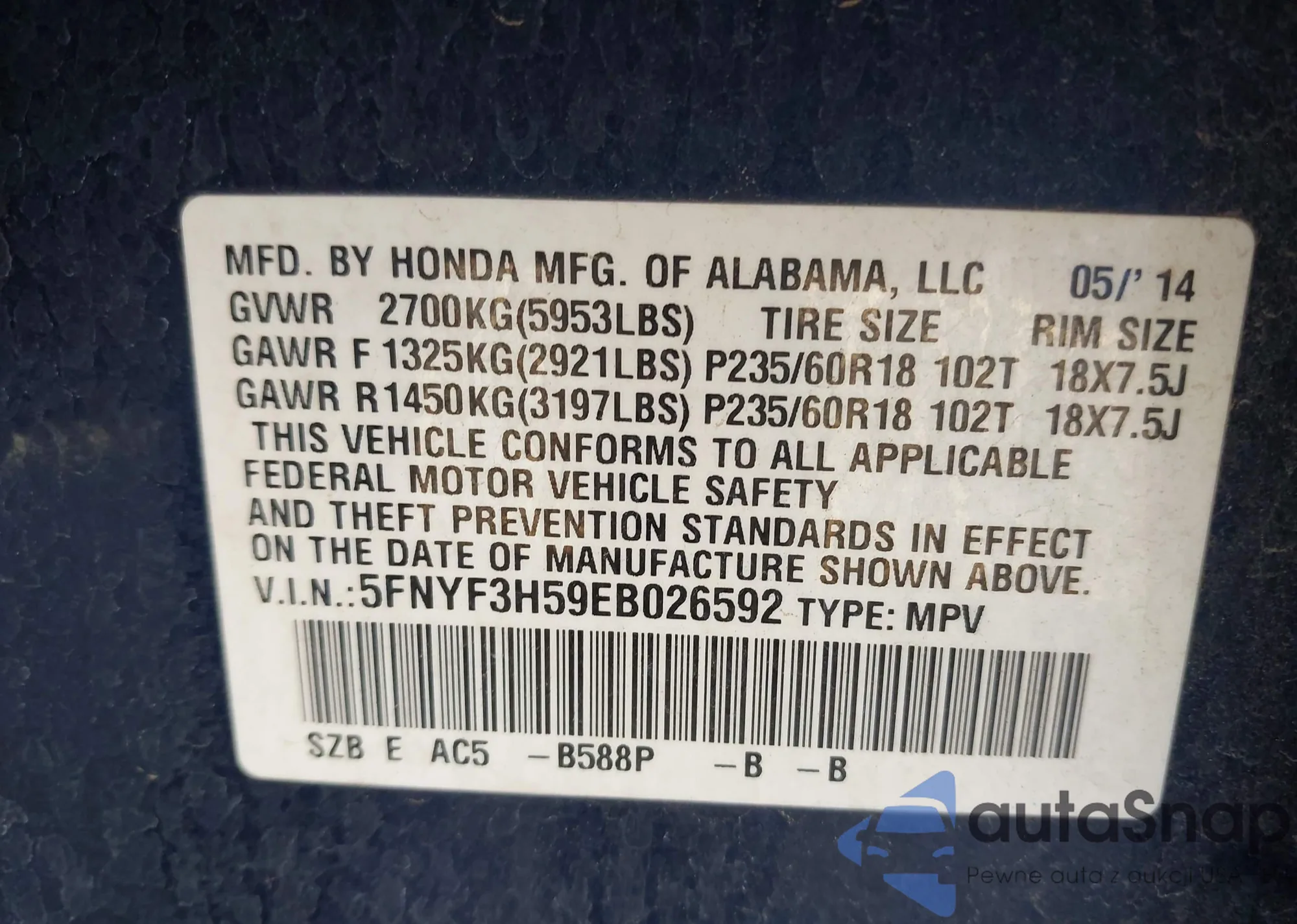 • VIN 5FNYF3H59EB026592