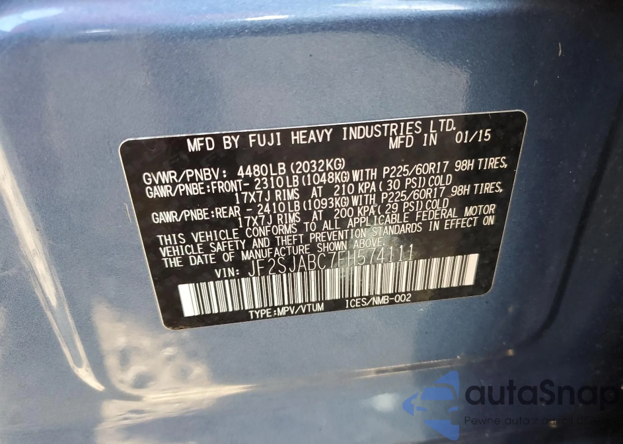 LOT: 92367805 VIN: JF2SJABC7FH574111