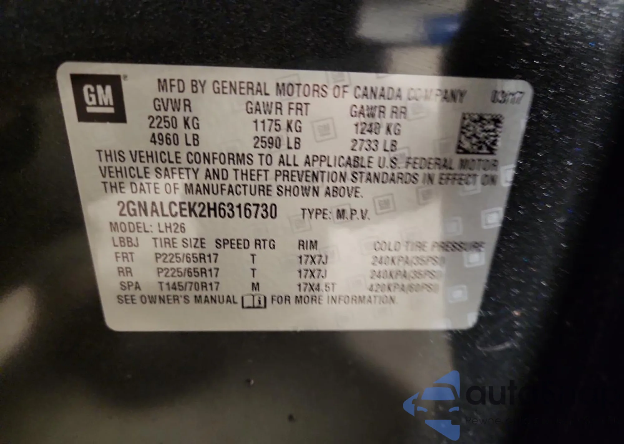 • VIN 2GNALCEK2H6316730