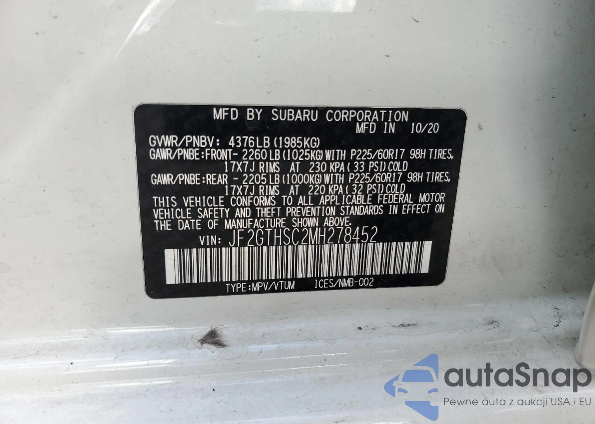 LOT: 89679115 VIN: JF2GTHSC2MH278452