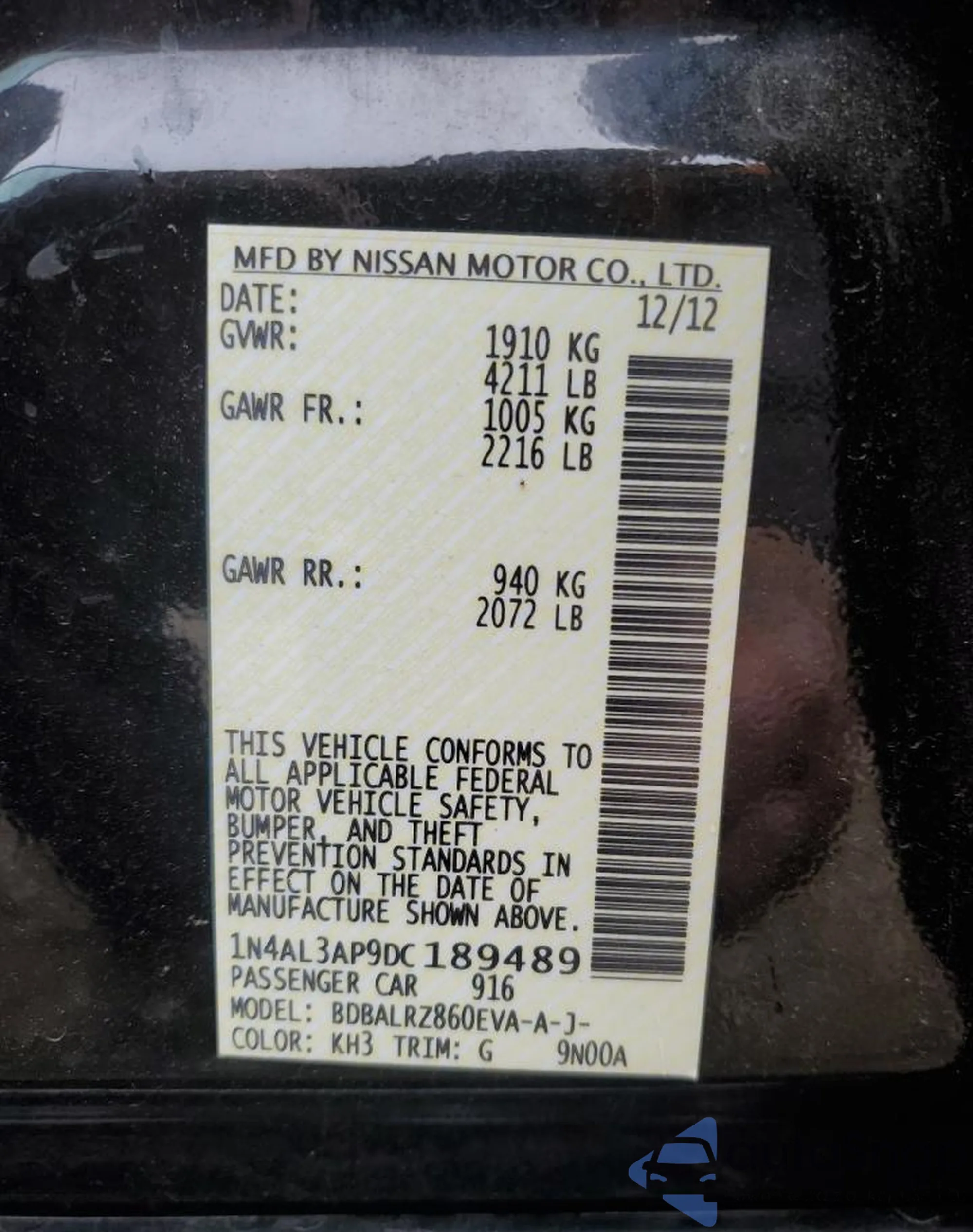 • VIN 1N4AL3AP9DC189489