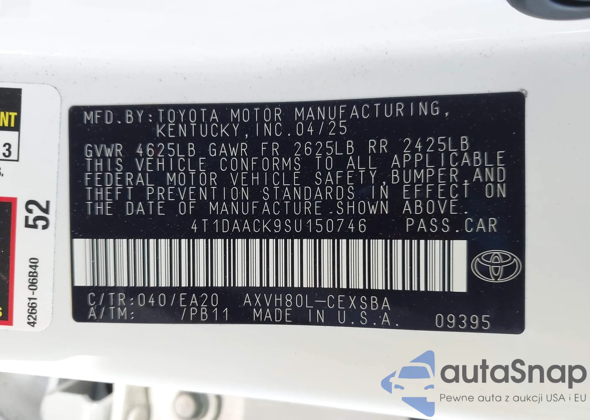 LOT: 43622012 VIN: 4T1DAACK9SU150746