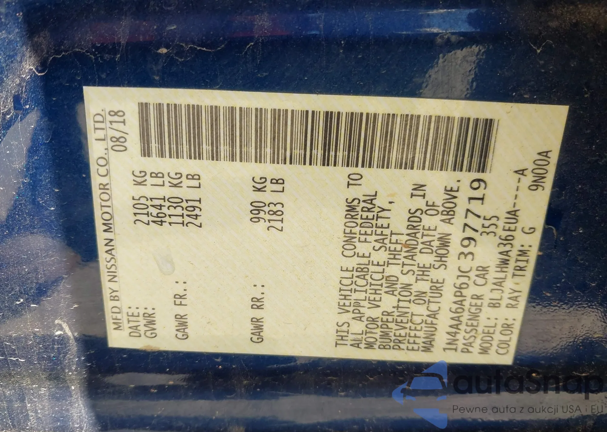• VIN 1N4AA6AP6JC397719