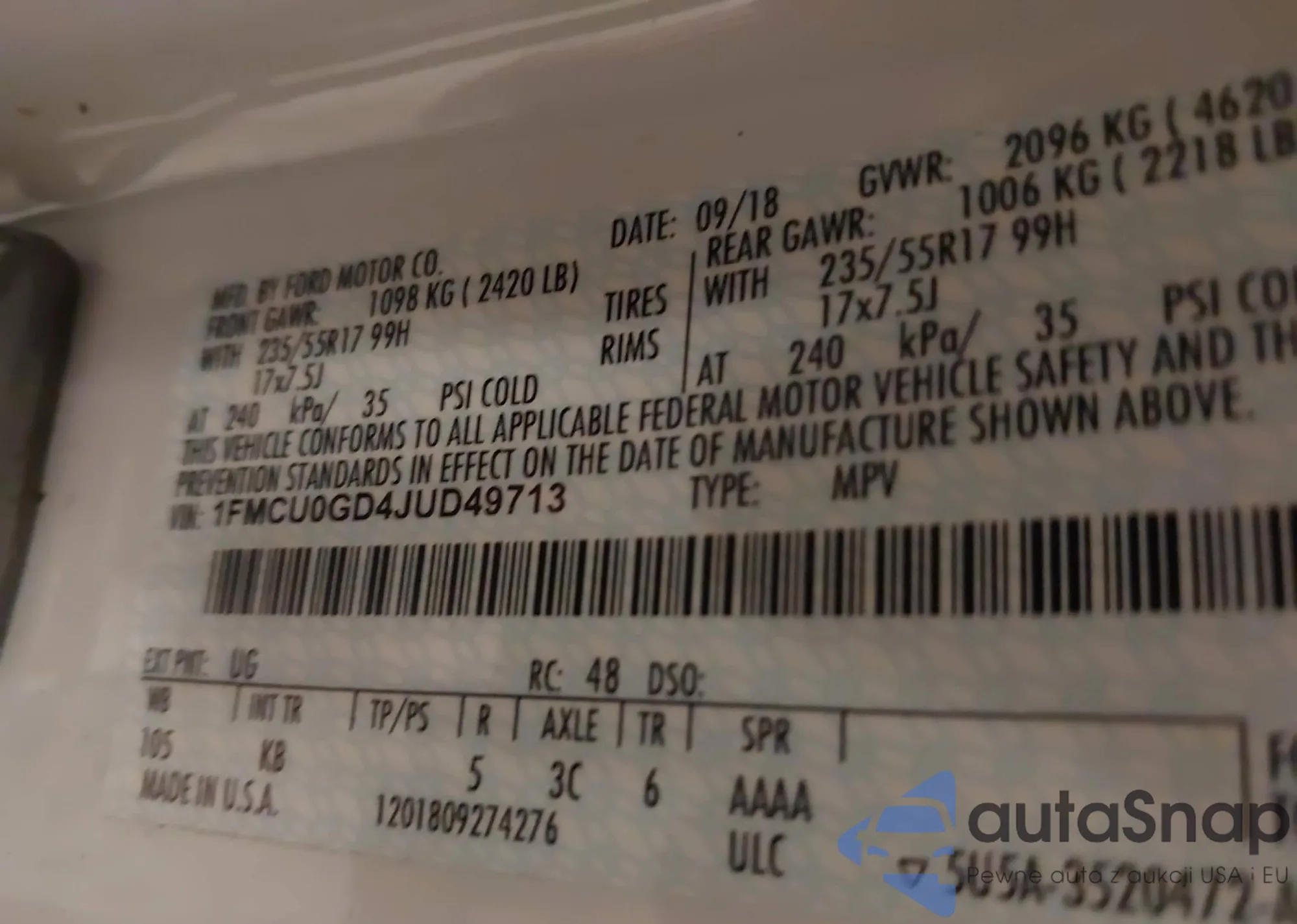 LOT: 43495312 VIN: 1FMCU0GD4JUD49713