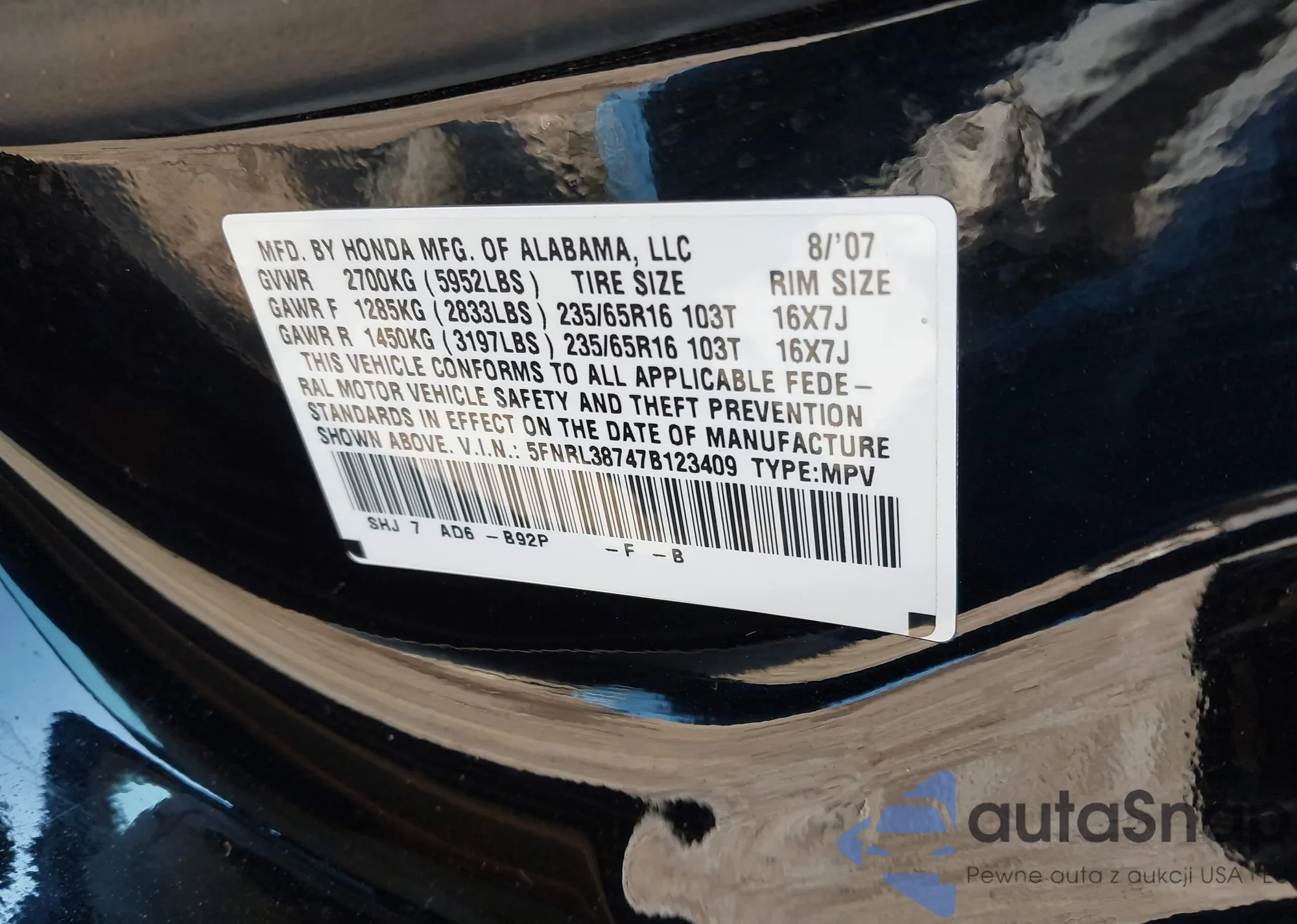 • VIN 5FNRL38747B123409