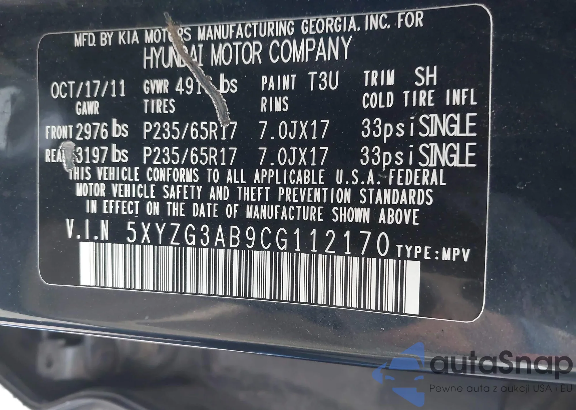 • VIN 5XYZG3AB9CG112170