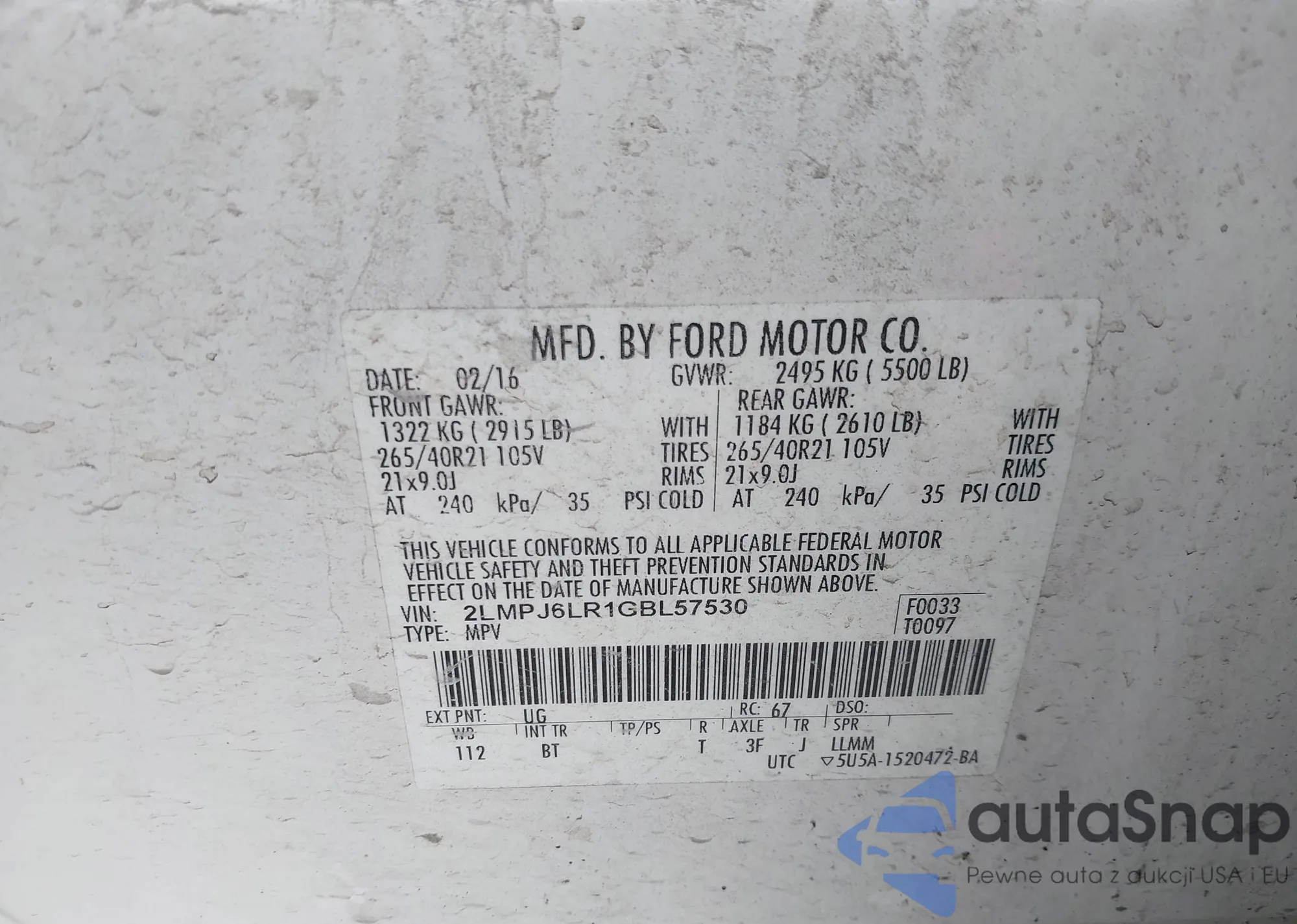 LOT: 43361585 VIN: 2LMPJ6LR1GBL57530