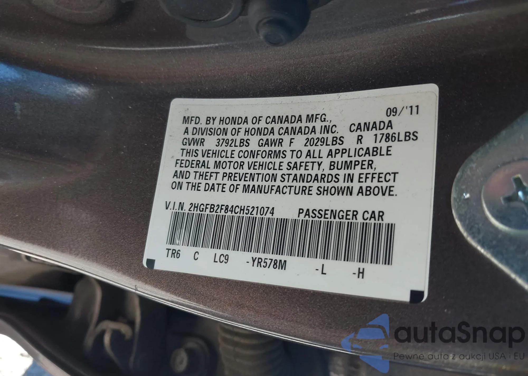 LOT: 43535620 VIN: 2HGFB2F84CH521074