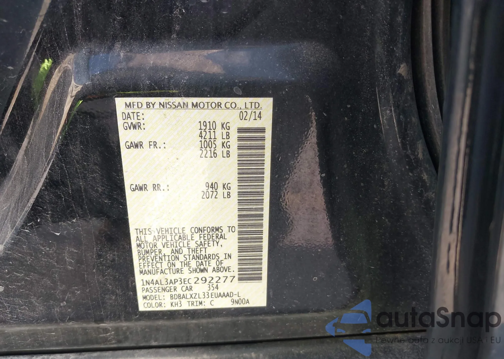 • VIN 1N4AL3AP3EC292277