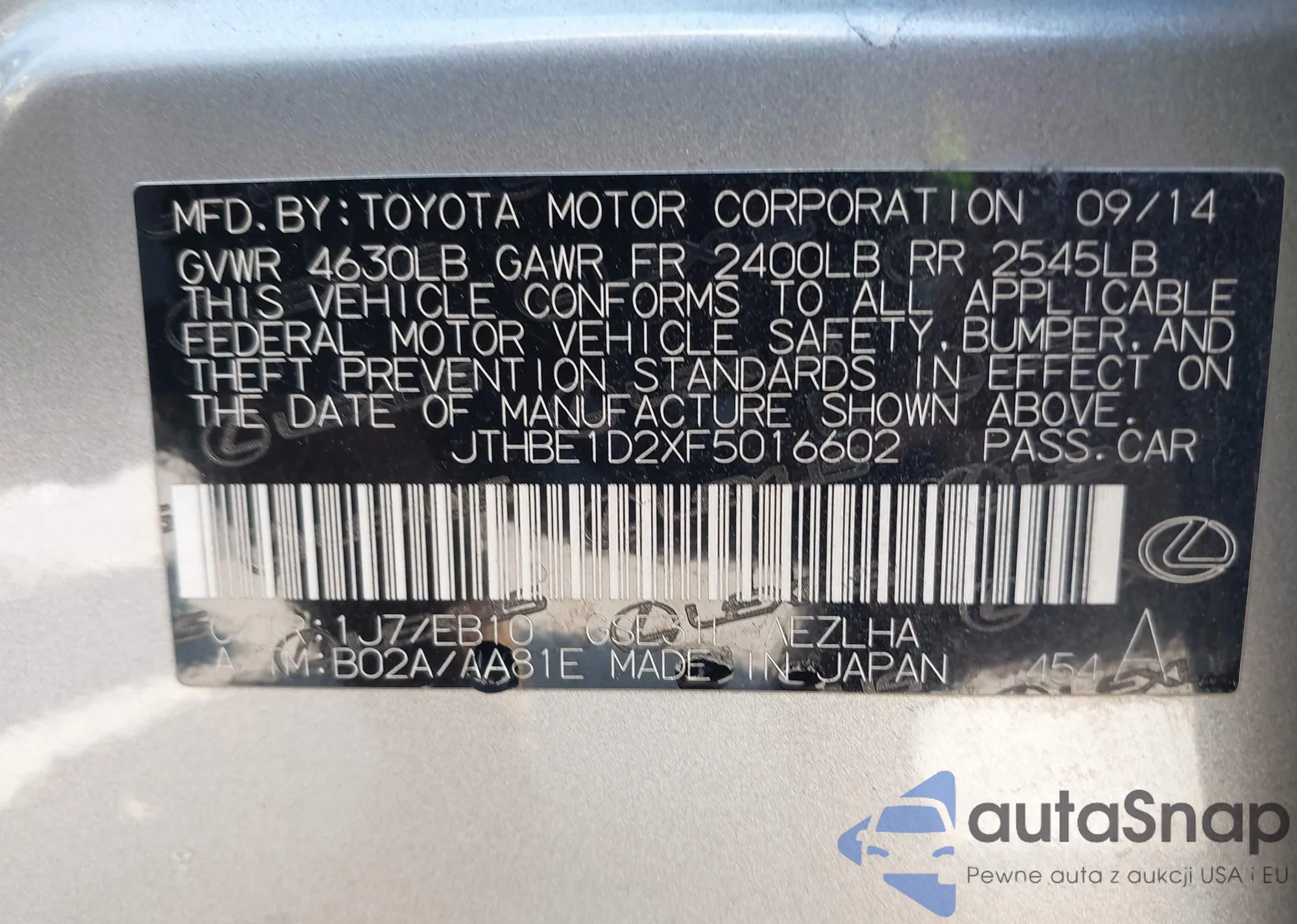 LOT: 43300519 VIN: 4T1BF3EK2AU036054