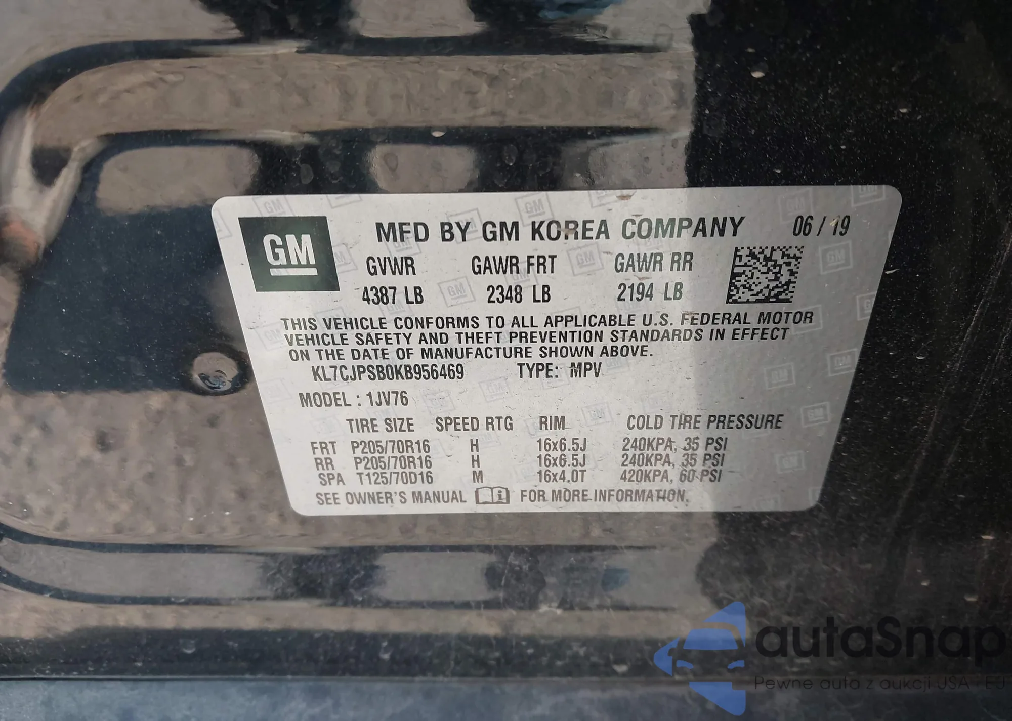 • VIN KL7CJPSB0KB956469