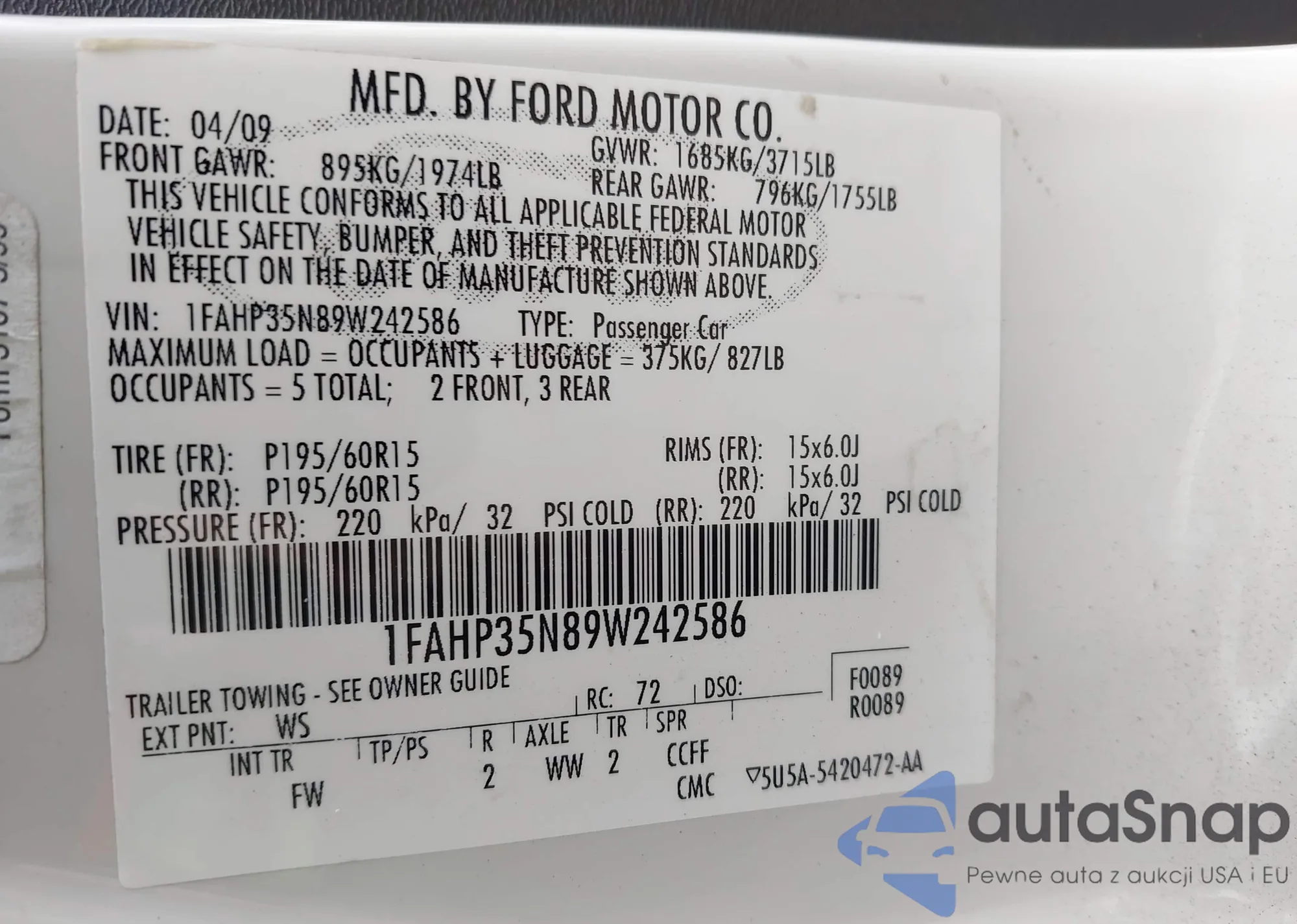 • VIN 1FAHP35N89W242586