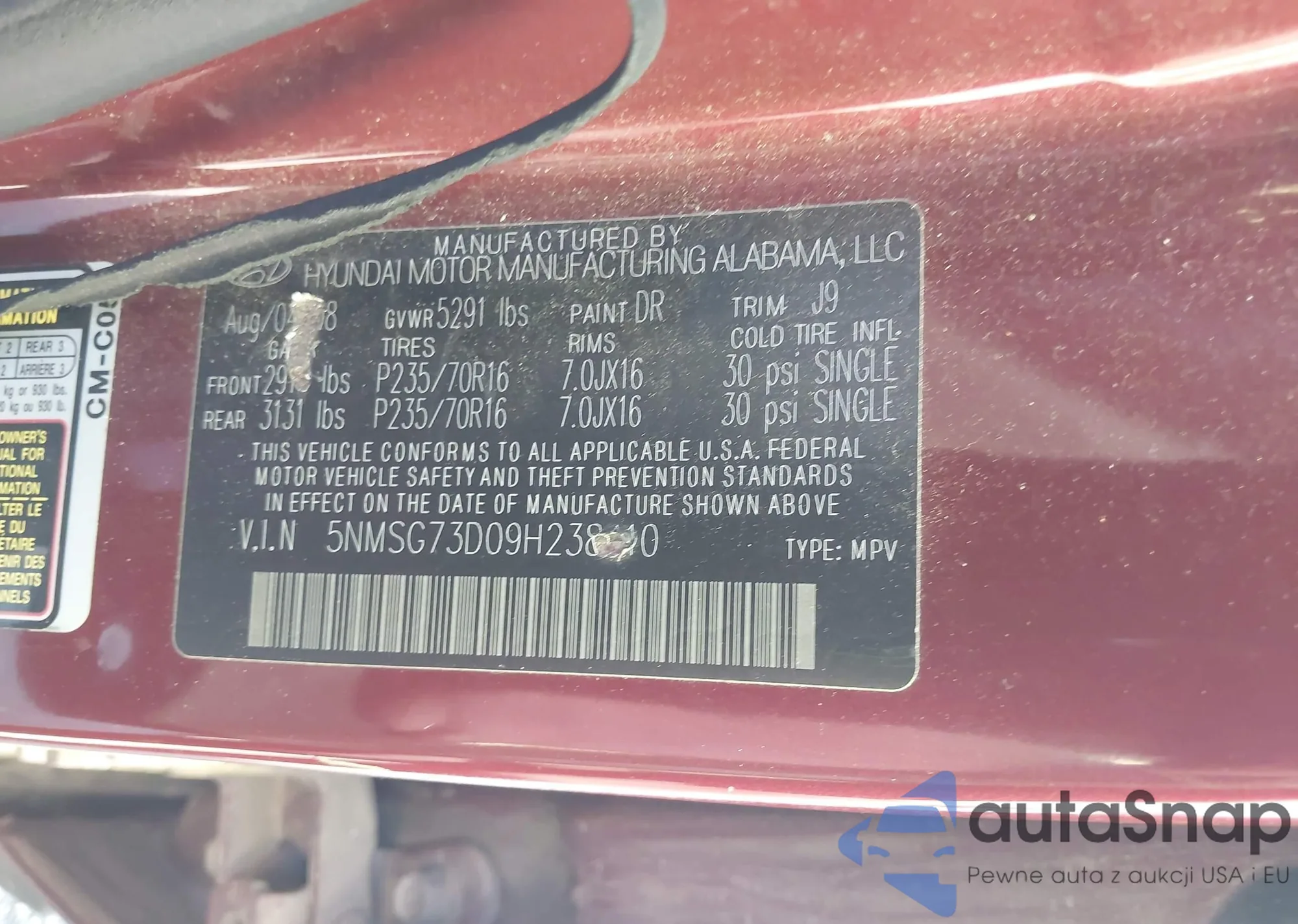 LOT: 43475522 VIN: 5NMSG73D09H238410