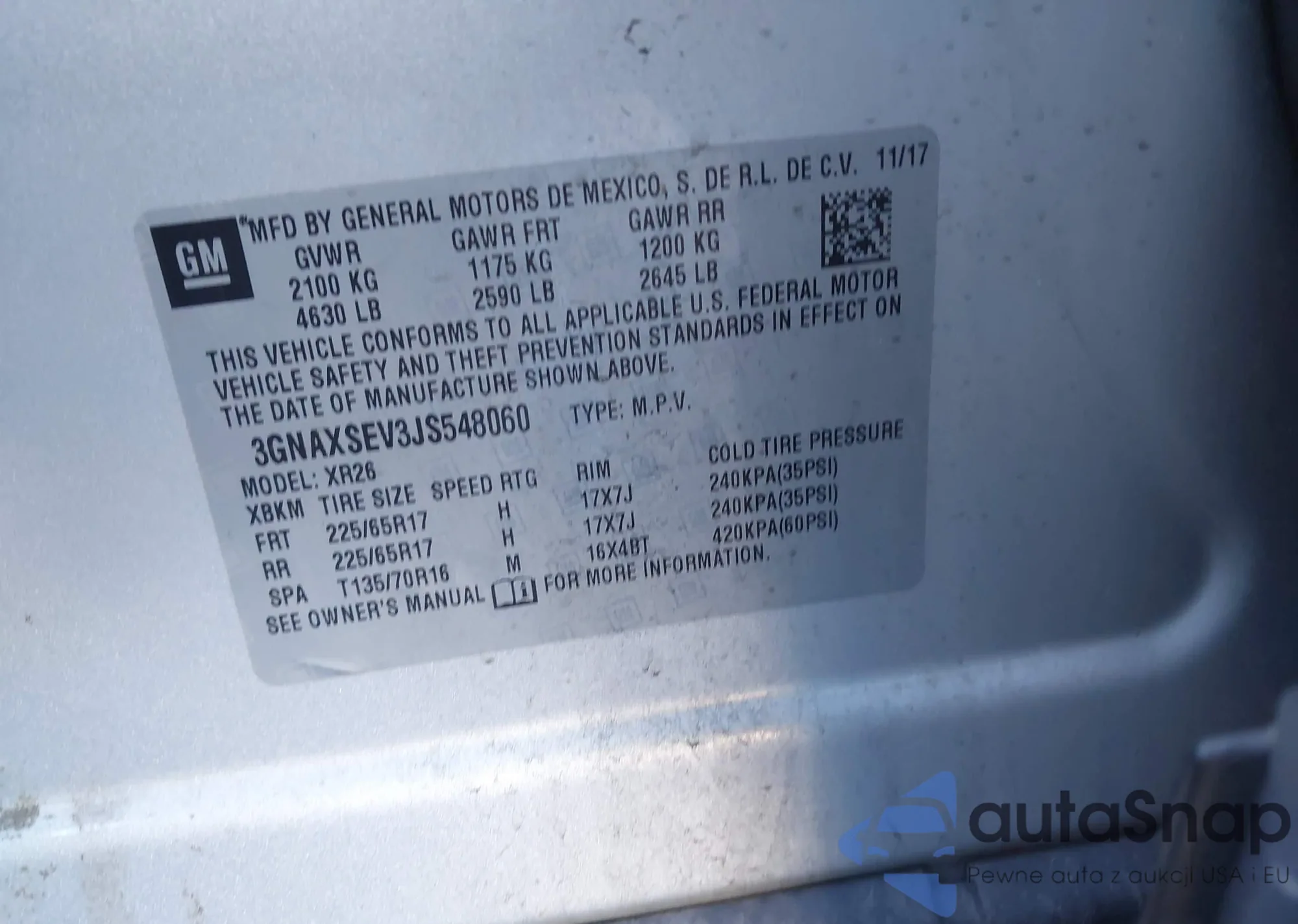 LOT: 43522555 VIN: 3GNAXSEV3JS548060