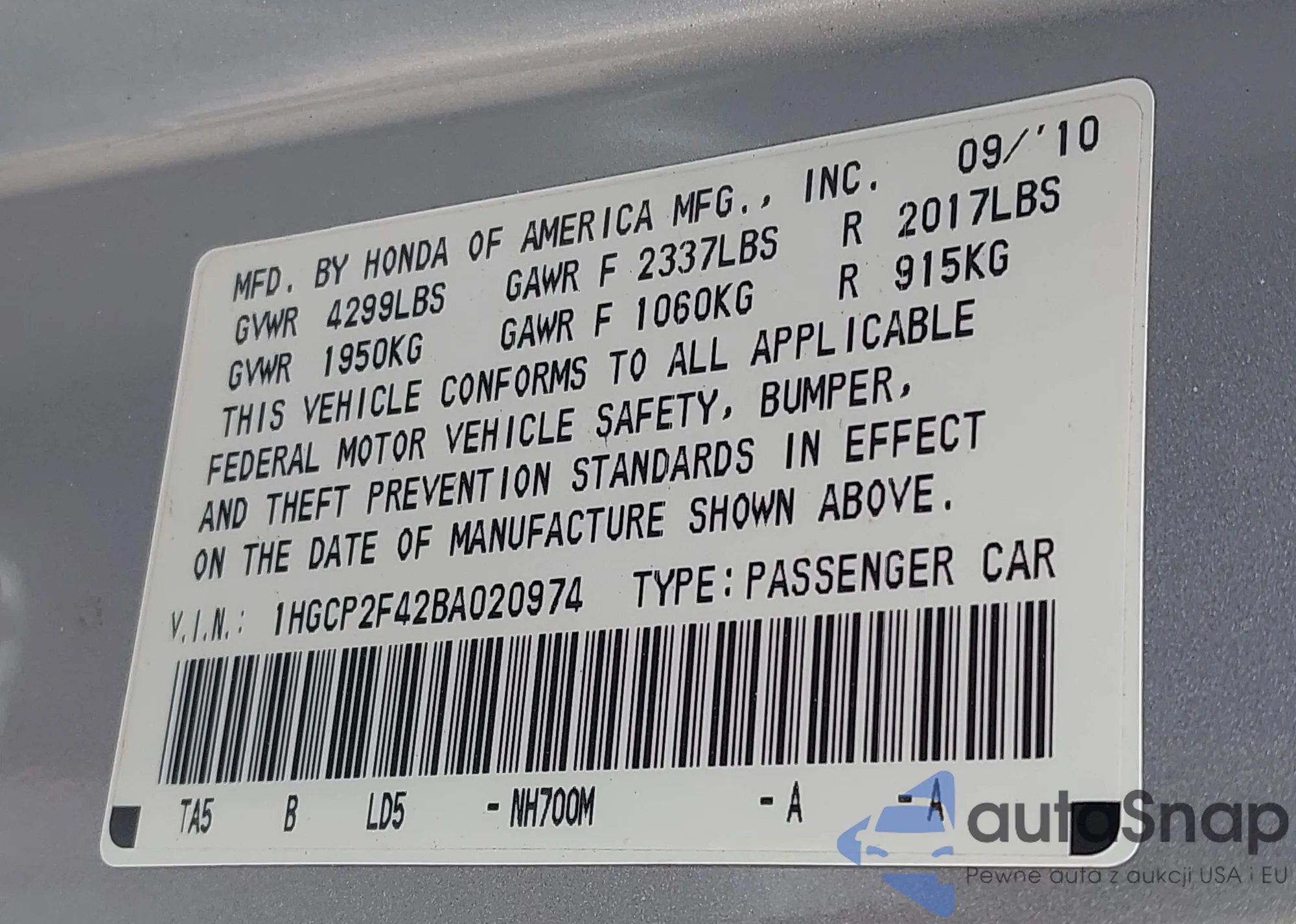 LOT: 43370112 VIN: 1HGCV1F41JA015991