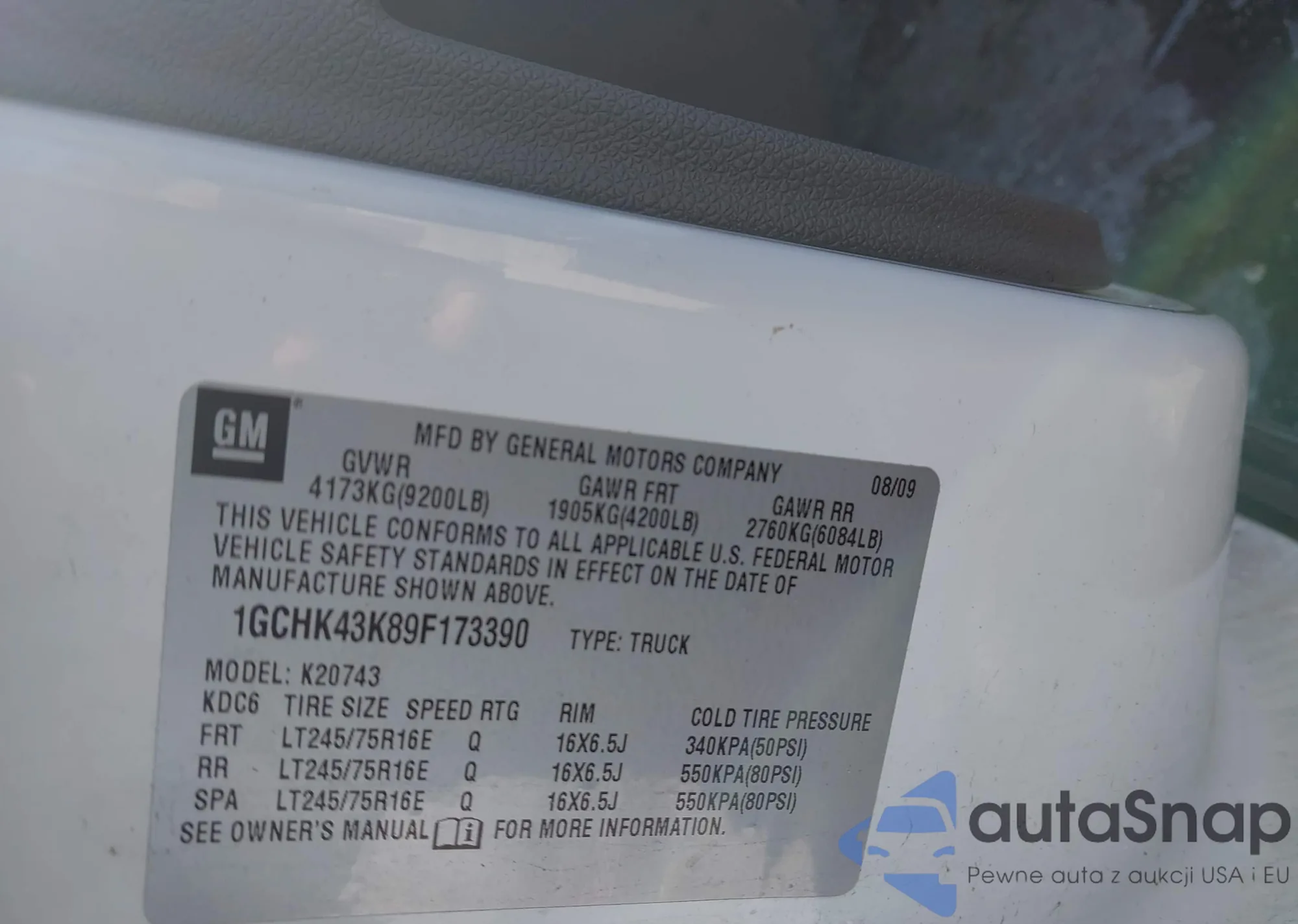 LOT: 43394387 VIN: 1GCHK43K89F173390
