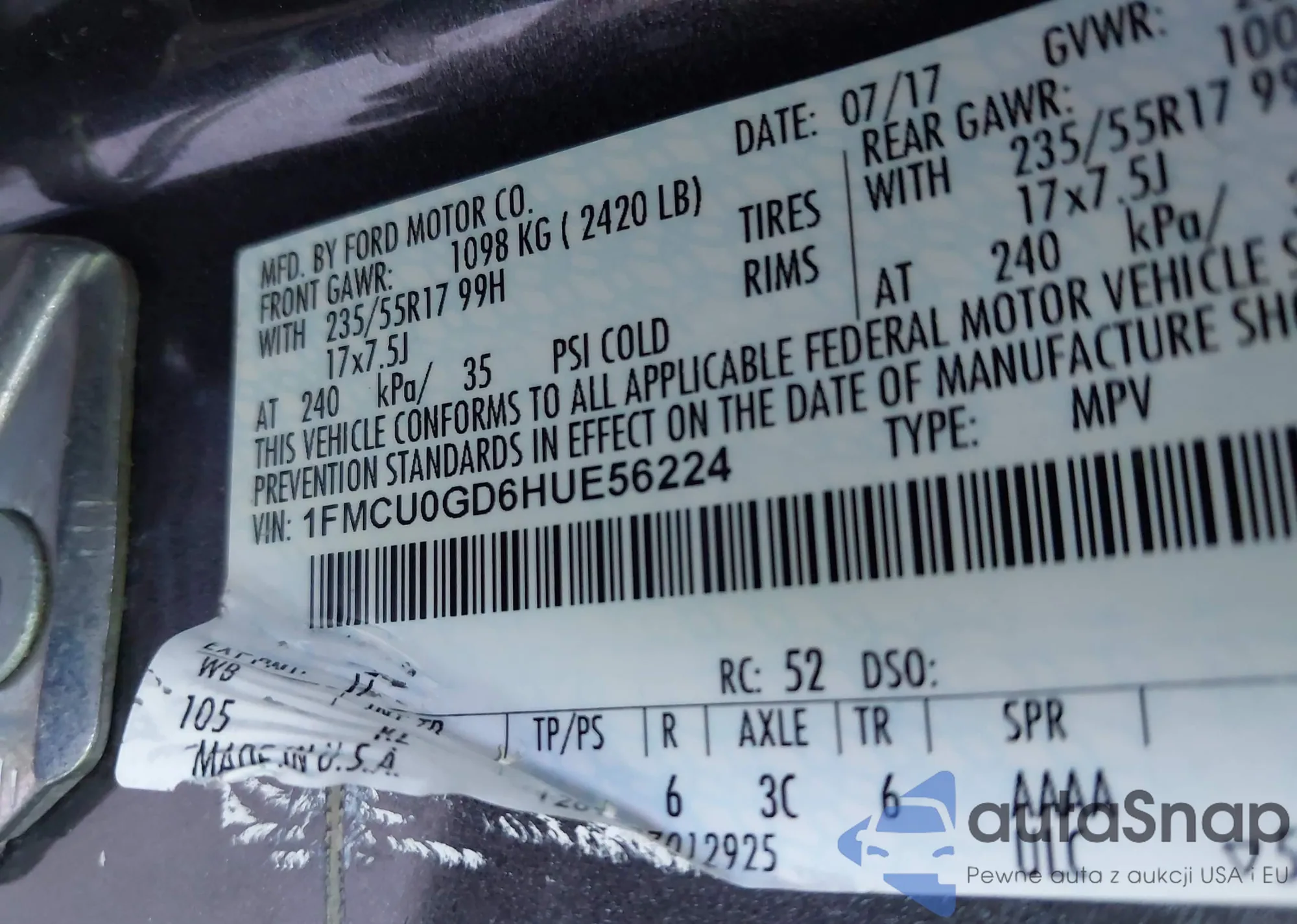 LOT: 43496931 VIN: 1FMCU0GD6HUE56224