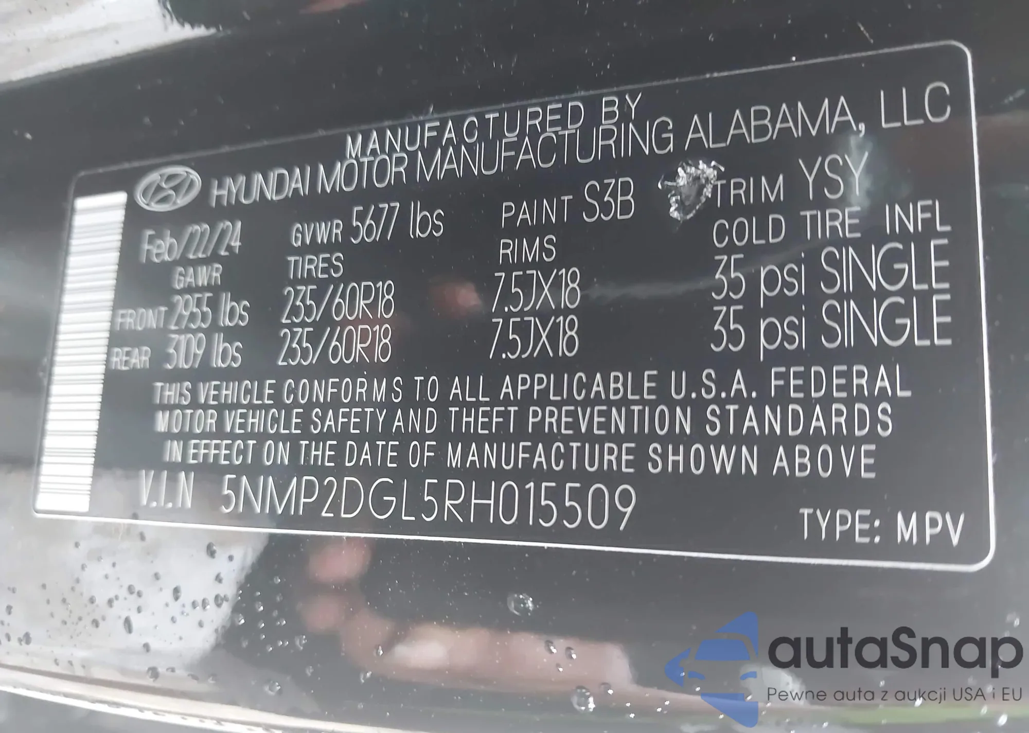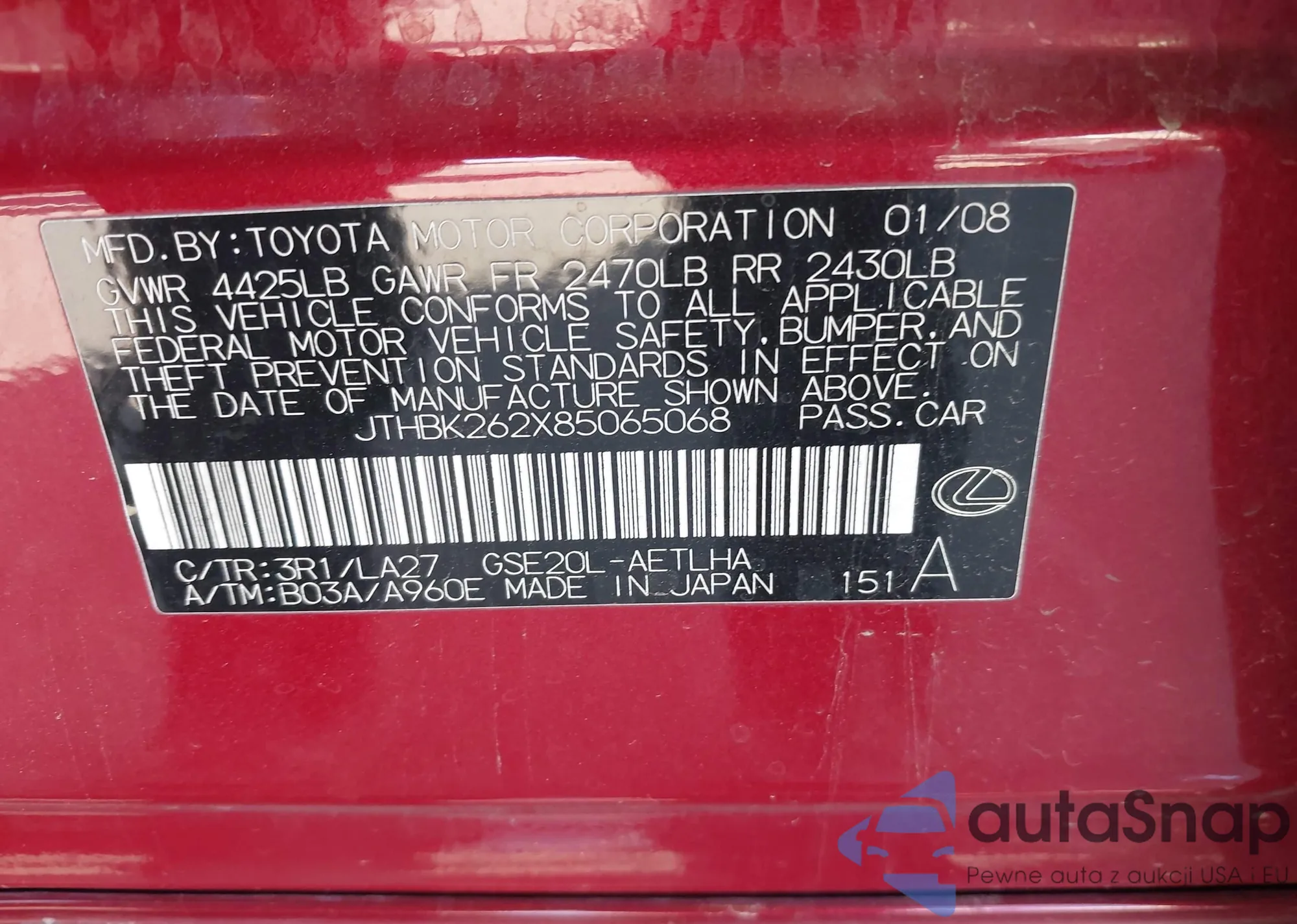 LOT: 43527704 VIN: 5NMSH73E68H137683