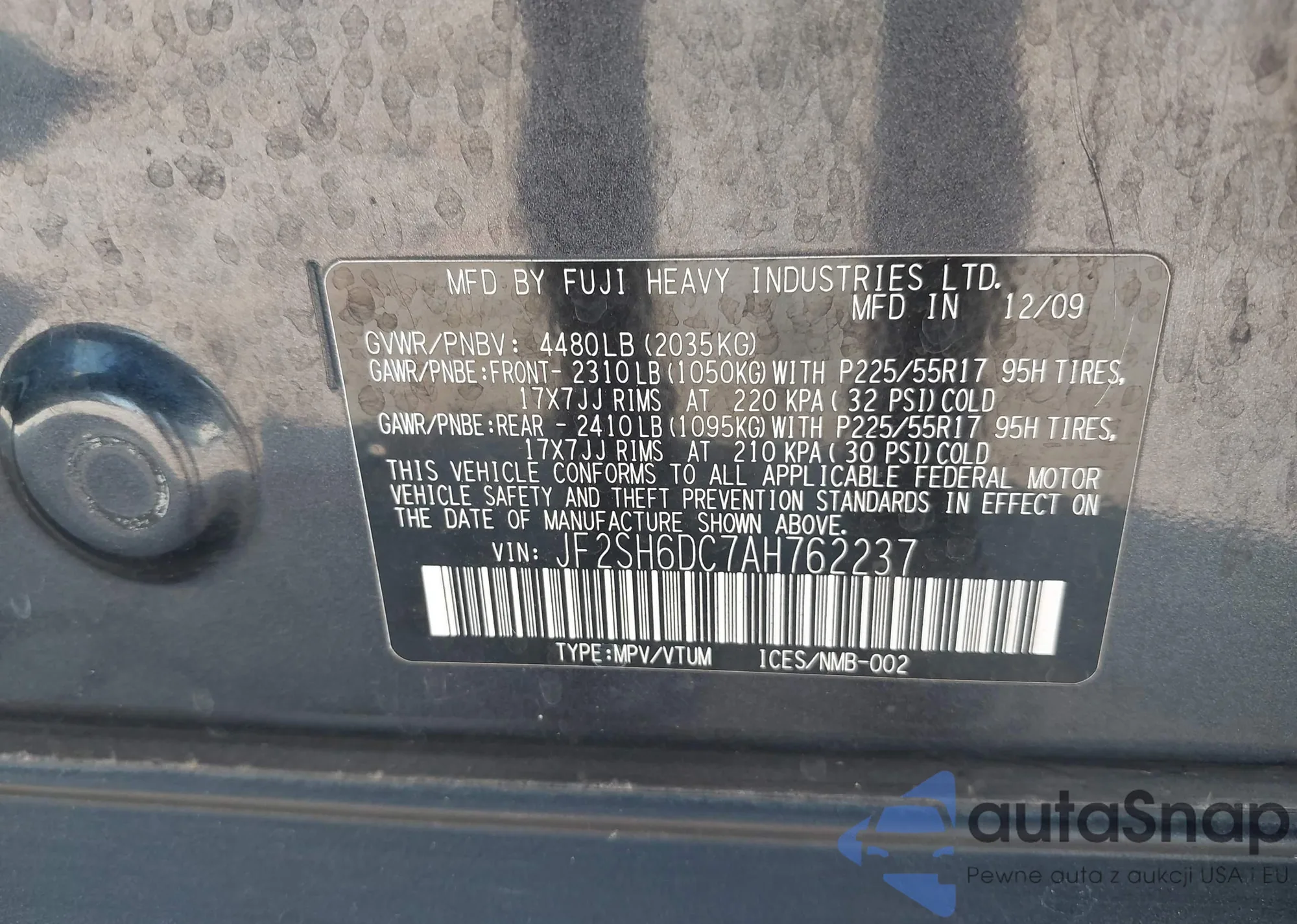 LOT: 43305324 VIN: JF2SH6DC7AH762237