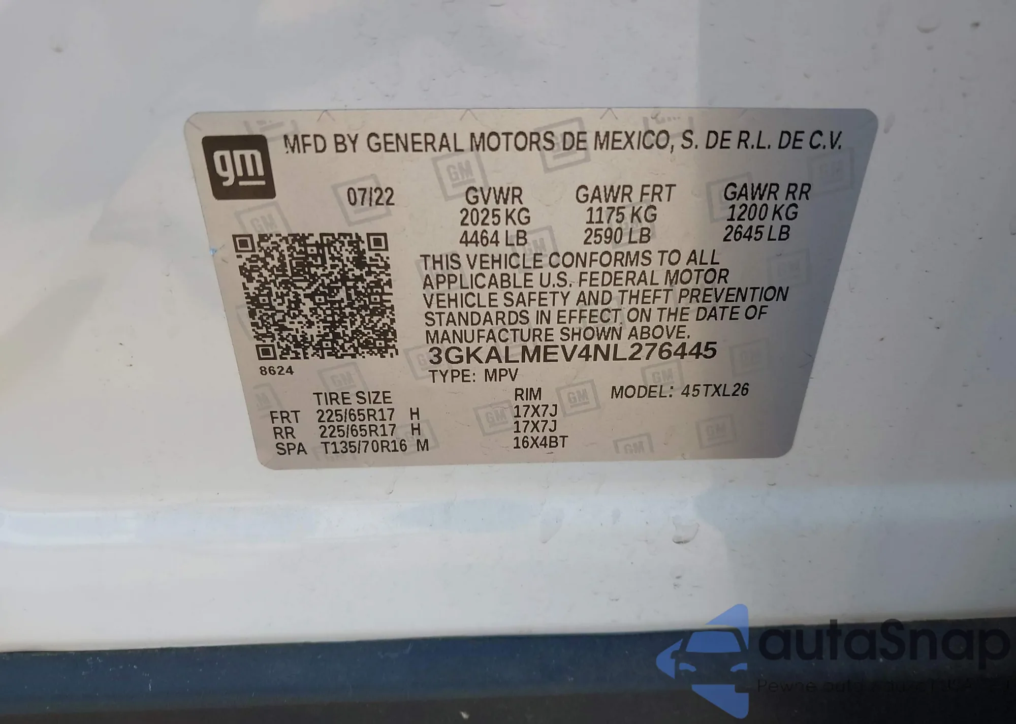 LOT: 43174446 VIN: 3GKALMEV4NL276445